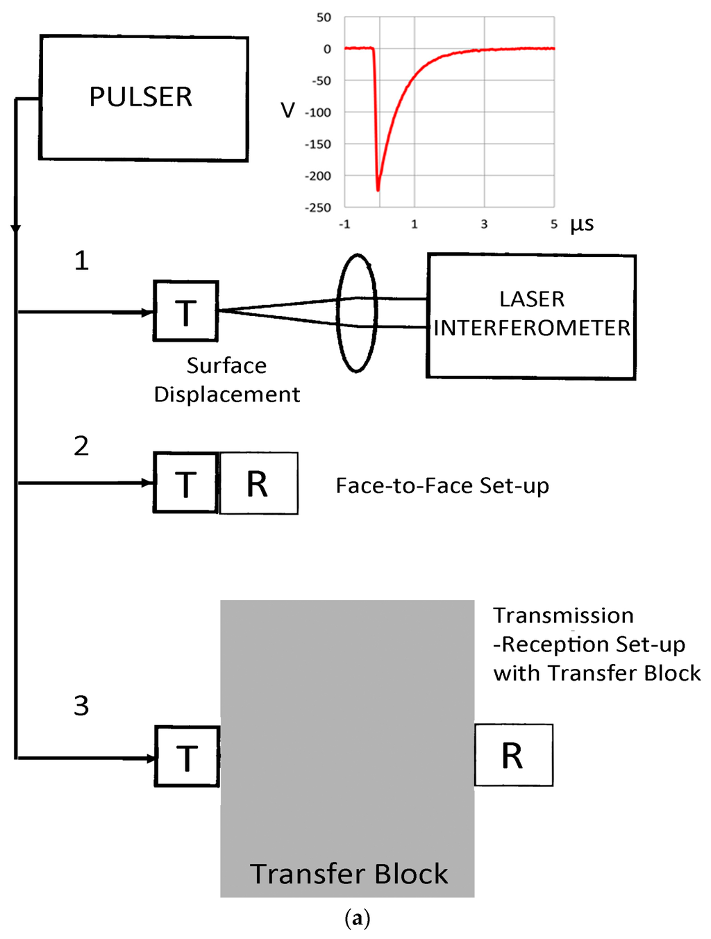 In ultrasonic testing (UT) and acoustic emission (AE) testing, transducers and sensors are essential components of a nondestructive test (NDT) system. The characterization of this component has been the subject of many studies over the years. Notable reviews on AE sensor calibration were provided by Sachse and Hsu, Hsu and Breckenridge and Hill [1,2,3]. Recently, three books on ultrasonic transducers appeared; one is by Schmerr and Song [4] and another edited by Vives [5]. Both books have analyzed ultrasonic transducer behavior from the systems approach, providing a good foundation of system modeling based on the electrical equivalent circuit representation. Using the reciprocity principle and reflector responses, transducers immersed in fluid have been characterized satisfactorily. The third book is by Sherman and Butler [6], which is directed toward underwater acoustics, but provides the most detailed discussion on piezoelectric sensing with an electroacoustic approach. In extending this lumped-parameter approach to cases of interest in NDT (or non-destructive evaluation, NDE), the need of the network analyzer presents an obstacle, since it is not commonly available in NDE laboratories. The other is the extensive use of contact transducers that often change their behavior from the air-loaded condition to a solid-loaded state. An example is shown in Figure 1. Figure 1a illustrates the three experimental methods used. A pulser generates a short pulse of a 200+ V peak with a few µs duration, which drives a transmitting transducer. In set-up 1, the surface normal displacement is detected by a laser interferometer at the center of the transmitter, T. In set-up 2, it is detected by a receiving sensor, R, which is acoustically coupled to T via a thin couplant layer. In set-up 3, T and R are separated by a solid transfer block. Figure 1b shows the waveform from set-up 1. This AE sensor is made from a piezoelectric disk with minimal damping and its transmission curve (displacement vs. time by laser interferometry) reverberates to 0.9+ ms upon its excitation by a few µs-long pulses (see the top of Figure 1a) with a persistent 30 kHz component. When it is in contact (so-called face-to-face arrangement, set-up 2) with a broadband receiver (Figure 1c), trailing oscillations essentially dissipate by 80 µs. Moffatt [7] discussed this front-face loading effect while developing rod-backed broadband sensors. It was also recognized in applying laser techniques to transducer calibration [8]. Such changes and other damping effects are difficult to predict theoretically and have not been treated satisfactorily. In some well-damped transducers, laser techniques provided satisfactory results, although radial resonance effects are more difficult to eliminate. In the present study, laser interferometry is utilized as the basis for transducer characterization. This was discussed extensively by, e.g., Scruby and Drain [8], but has so far not been widely used in NDE practice due to high cost. In UT transducer calibration, more advanced methods have appeared and the frequency range is extended to 20 MHz routinely [9] and to 100 MHz in the laboratory [10,11,12,13,14]. These include uses of direct measurement of particle velocity in water, time-delay spectroscopic methods, an optical multilayer hydrophone as a reference and pulse-echo with a reflector.