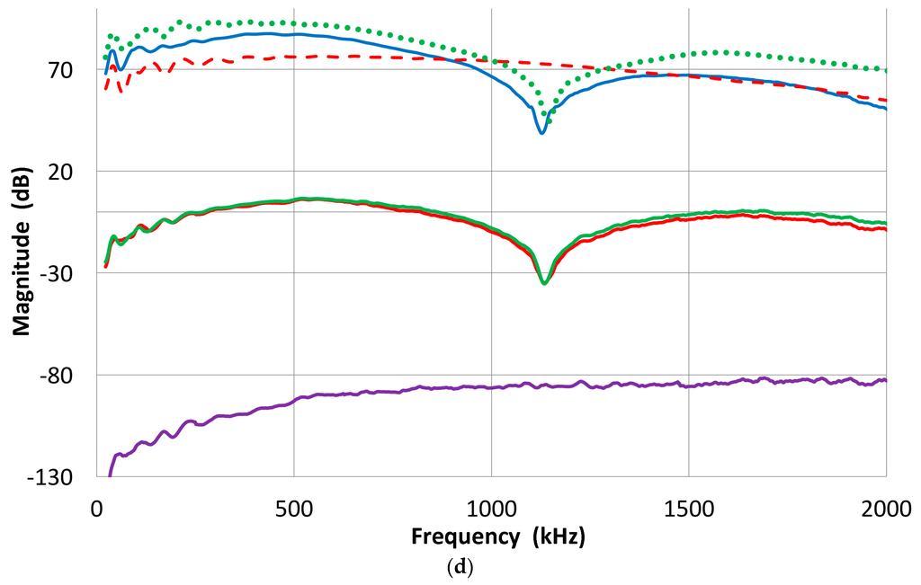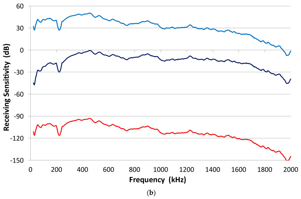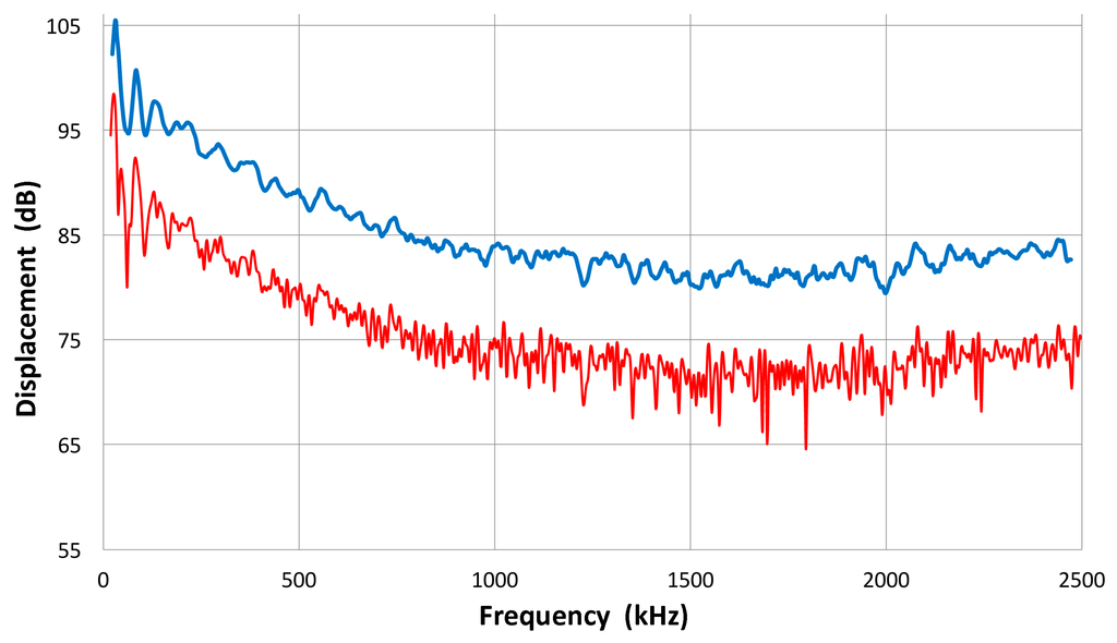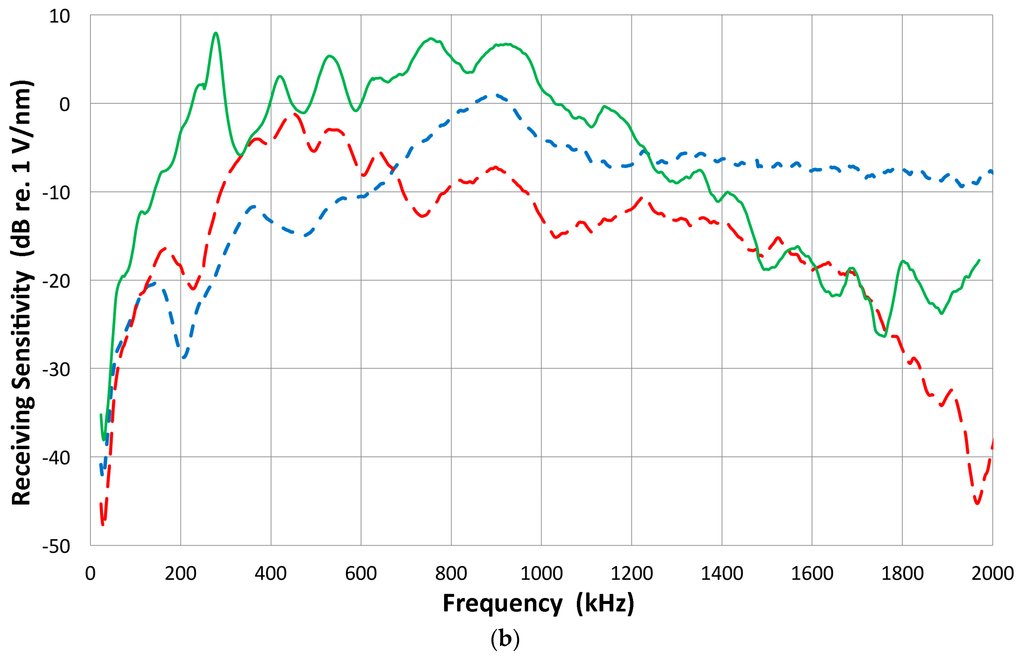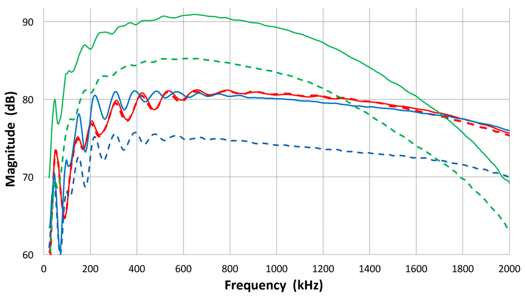 Here, it should be noted that the sensor output is usually terminated with 10 kΩ, which simulates typical AE preamplifiers. The cables used and the input capacitance of the digital scope (PicoScope 3405A) contribute 80 pF. In measurements involving piezoelectric elements, the impedance was at 100 MΩ with 2 pF. By using a 100× probe, the output voltage was 1–1.5 dB higher than with the 10 kΩ input impedance. In the pulse-echo ultrasonic instrument, on the other hand, this termination resistor is much smaller (5 to 50 Ω) and depends on the damping of the driving pulse generator. At high termination resistor values, we are measuring the voltage response of the sensor, while a low resistor value makes the sensor response the same as that of a short circuit or current response. We limit discussion to the voltage response or high termination resistance.
