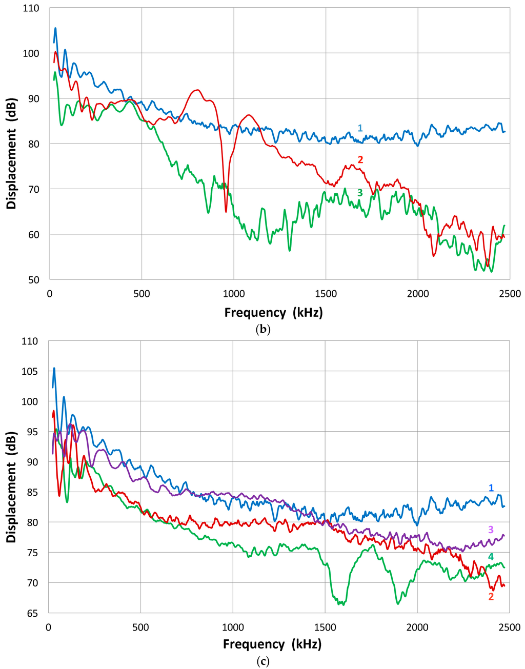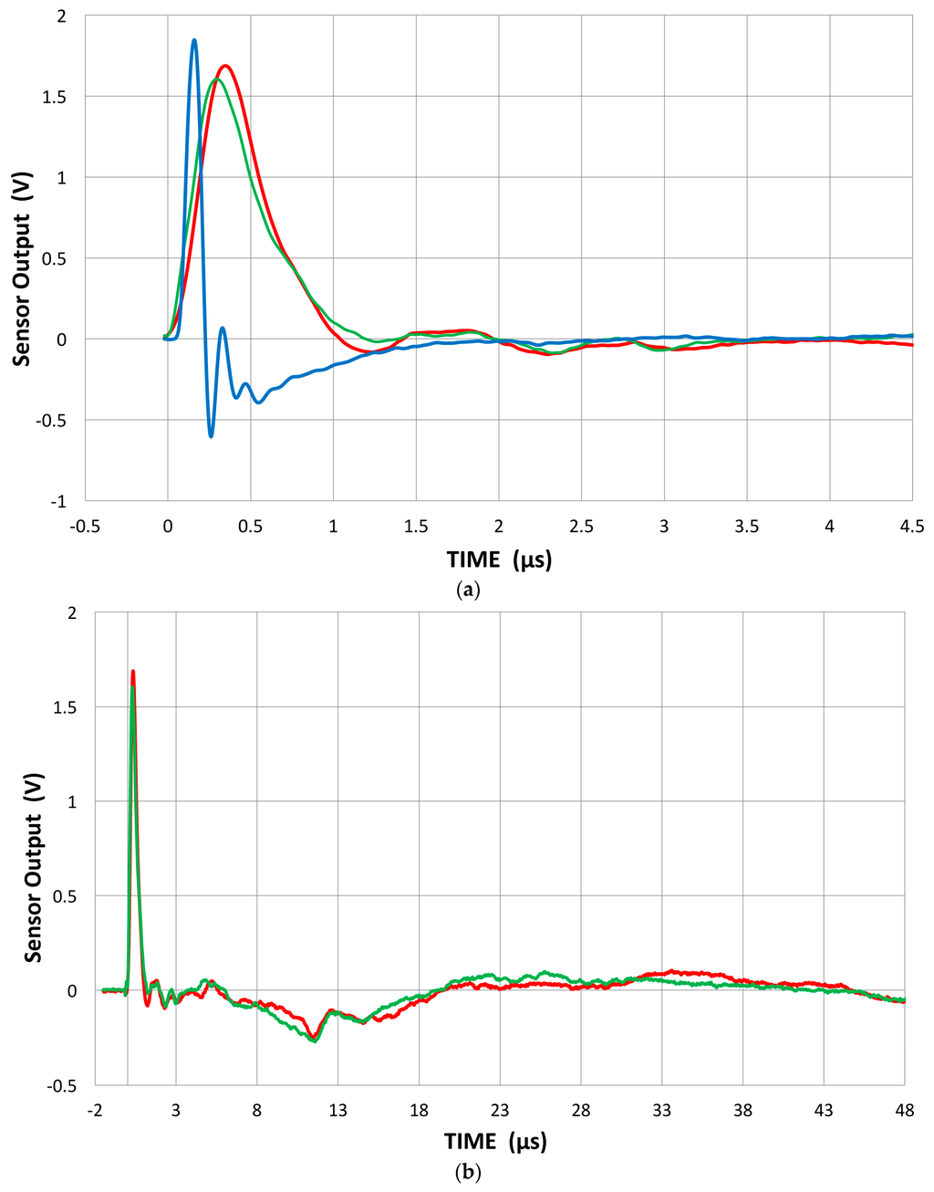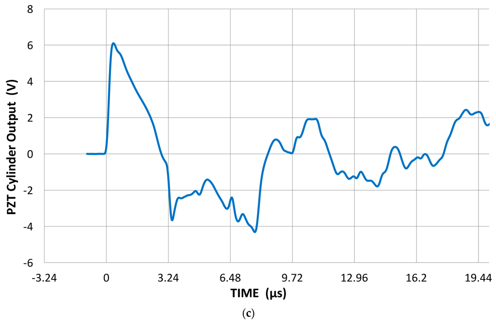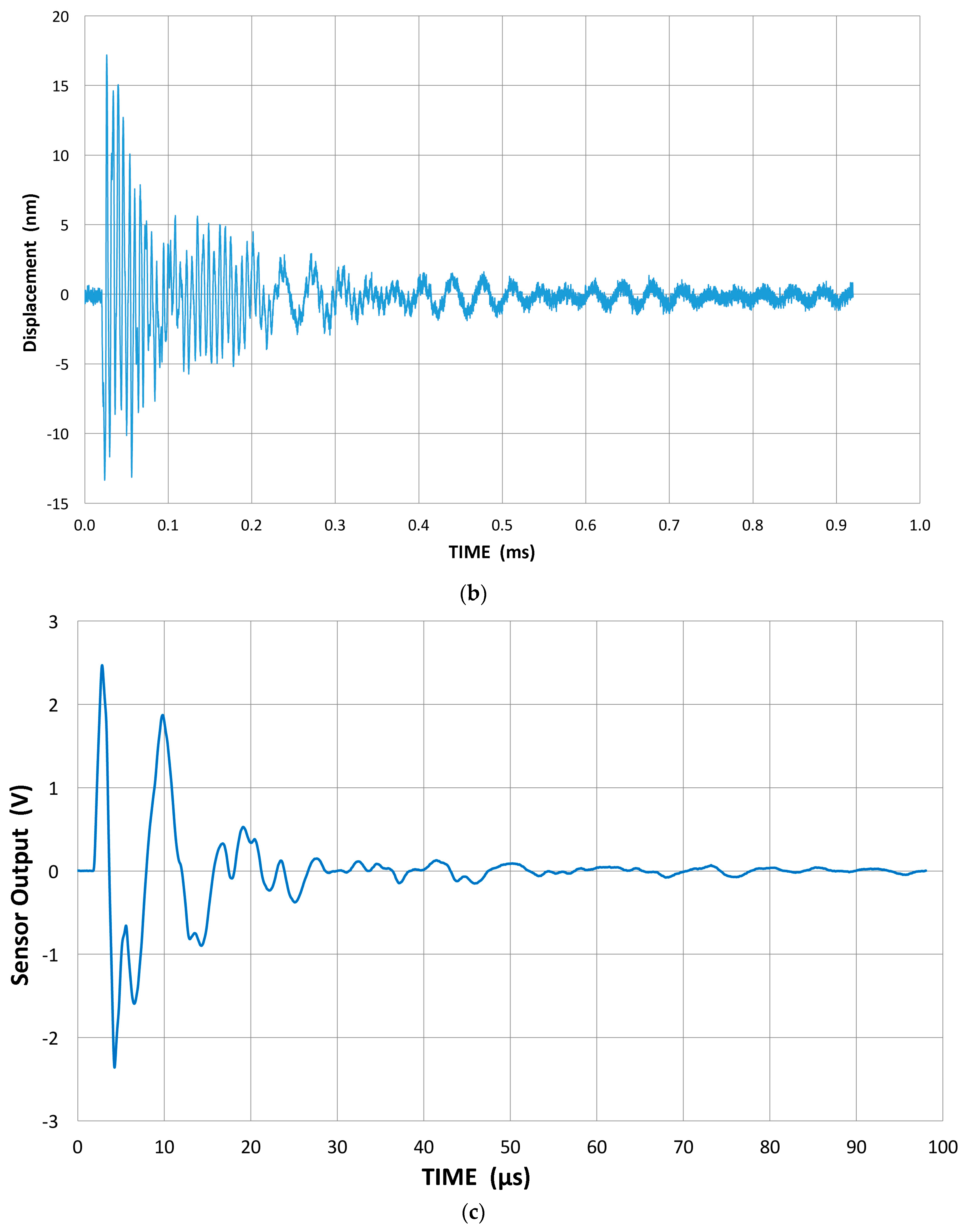 Here, it should be noted that the sensor output is usually terminated with 10 kΩ, which simulates typical AE preamplifiers. The cables used and the input capacitance of the digital scope (PicoScope 3405A) contribute 80 pF. In measurements involving piezoelectric elements, the impedance was at 100 MΩ with 2 pF. By using a 100× probe, the output voltage was 1–1.5 dB higher than with the 10 kΩ input impedance. In the pulse-echo ultrasonic instrument, on the other hand, this termination resistor is much smaller (5 to 50 Ω) and depends on the damping of the driving pulse generator. At high termination resistor values, we are measuring the voltage response of the sensor, while a low resistor value makes the sensor response the same as that of a short circuit or current response. We limit discussion to the voltage response or high termination resistance.