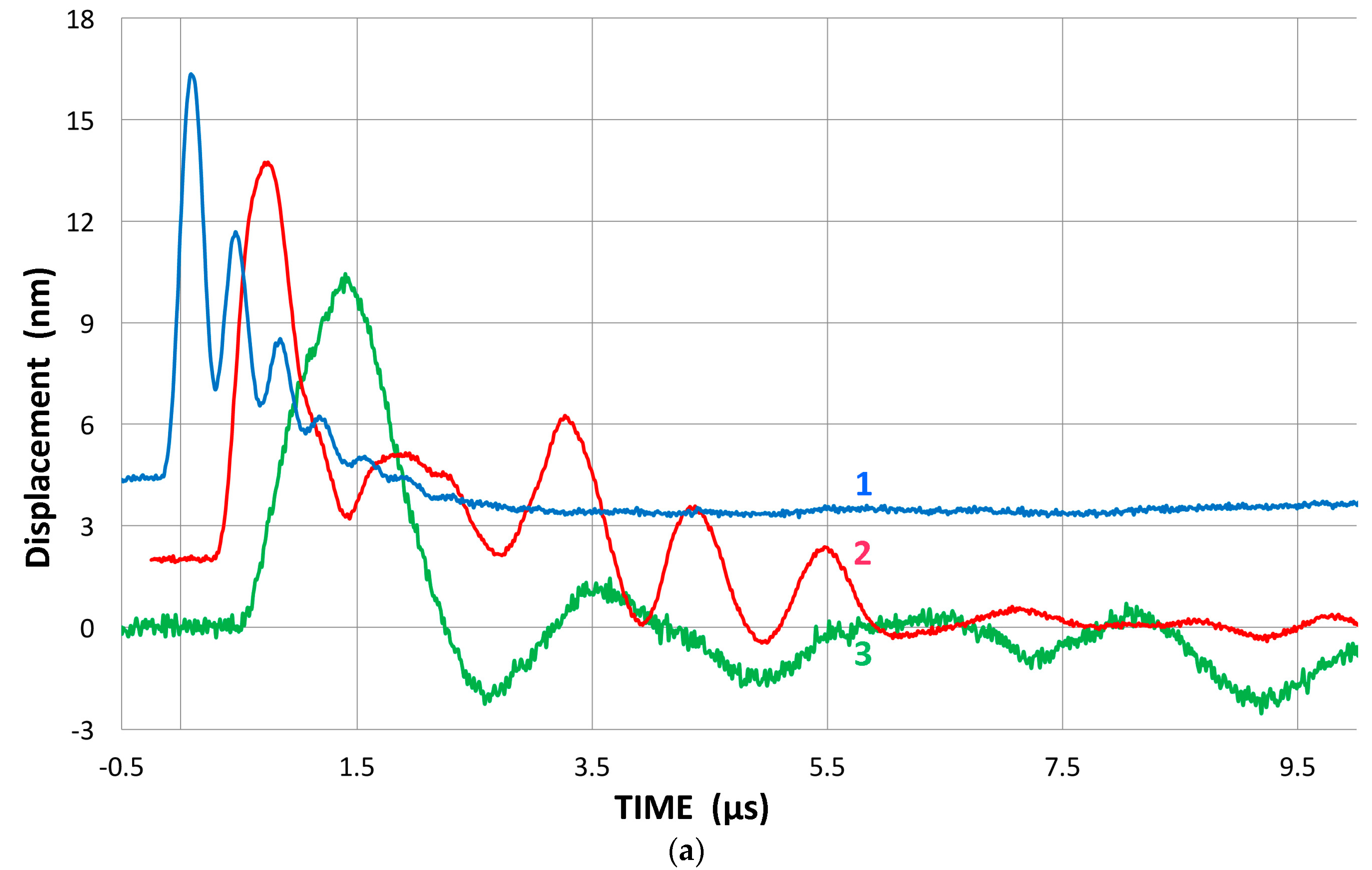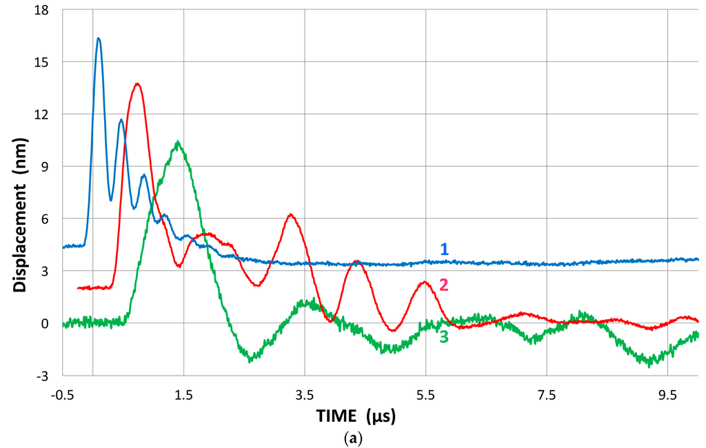 The observed displacement waveforms are basically of monopolar shape with trailing oscillations. This feature results from the forward radiation at the front face and the presence of the absorber behind the piezoelectric element, as predicted by Redwood and Kossoff [39,40]. The peak displacement value is approximately 50 pm/V. This displacement is about one half that of a typical lead-metaniobate piezoelectric element, which is presumed to be used in these transducers. Alternate elements of PZT ceramics are expected to produce displacements that are at least a few times larger. The other half of the piezoelectric displacement is radiated backward into the absorber and mostly damped. In addition, it is expected that a higher acoustic impedance of the sensor face material (usually alumina) causes a 2.3 dB reduction and also gives back reflection.