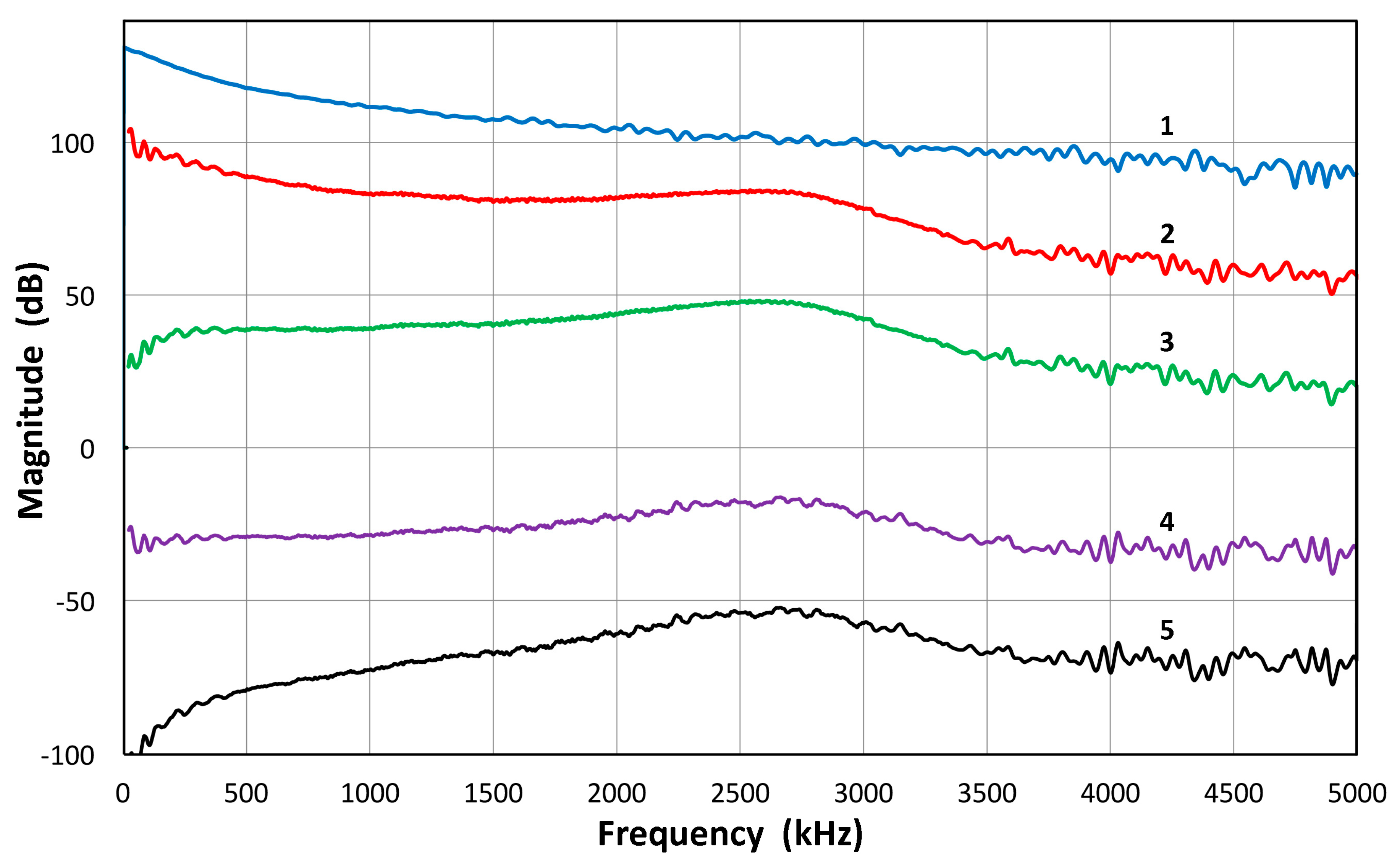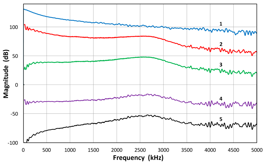 The magnitude spectra in Figure 3b,c do include the spectrum of the high voltage (HV) electrical pulse, which is a slowly decreasing function with frequency. It varies only slightly (within ±1.5 dB) among most transducers used. The transmission characteristics of V104 are shown in Figure 5 up to 5 MHz. This higher range covers the frequency of interest in UT. The HV pulse spectrum for the V104 test is included as the top curve, marked 1. The displacement transmitting spectra of V104 are curves 2 and 4. The latter is corrected by subtracting the HV FFT spectrum, indicating much less frequency dependence of V104 transmission and showing a broad peak at 2.6 MHz. The value of Q is 1.7. By multiplying the angular frequency, these curves are converted to show the velocity response of V104 transmission, shown as curves 3 and 5, with or without the HV electrical pulse spectrum. It was confirmed that the discrete differentiation of the displacement waveform using the Savitzky-Golay algorithm [41] results in an identical magnitude spectrum as that due to 2 πf multiplication (f = frequency), shown here.