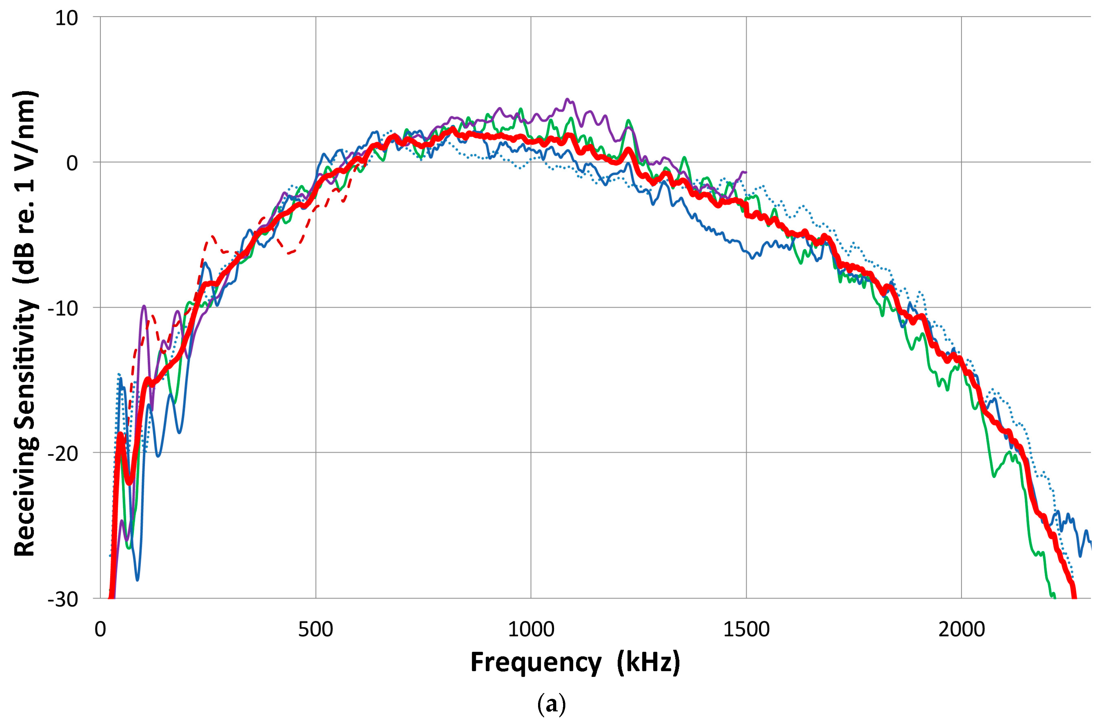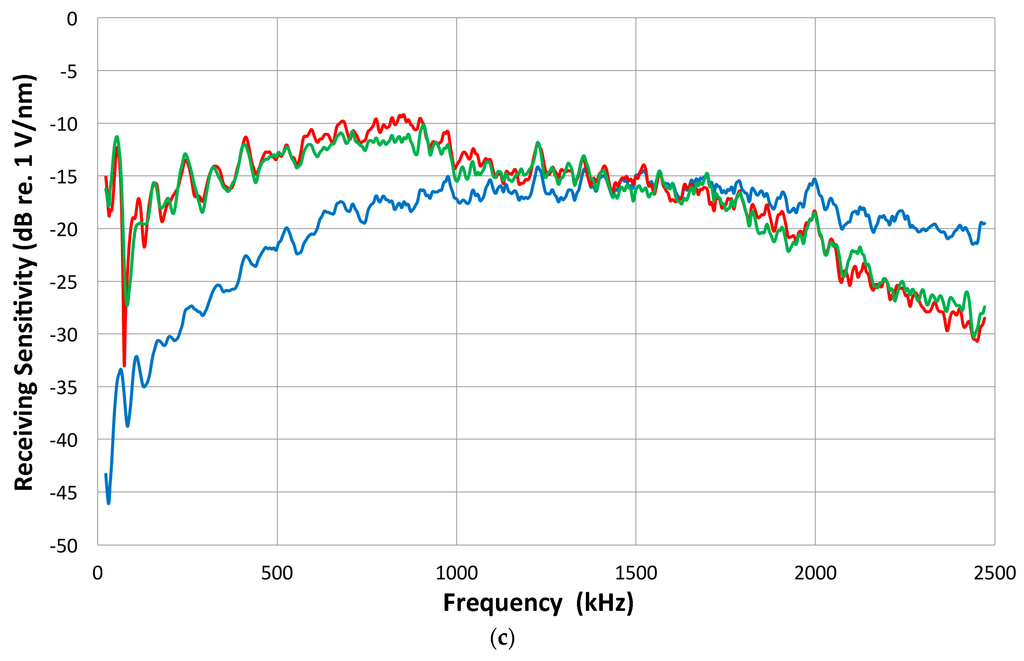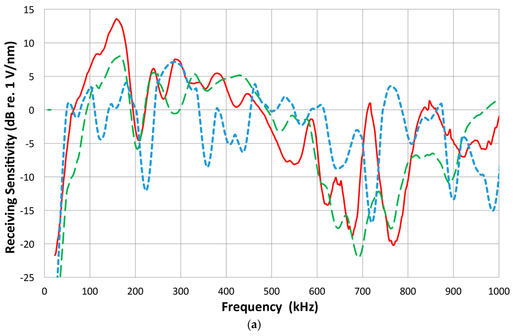 For a similarly designed conical sensor, McLaskey and Glaser [45] reported a much higher sensitivity of 0 dB or 1 V/nm and a very flat spectrum, but their sensitivity data appear to be overly generous. The sensitivity level is at least 10 dB too high compared to Greenspan’s theoretical analysis or Proctor’s experiment of NIST conical sensors [42,44]. The reference spectrum they used was a theoretical one without validation and their spectral results require critical examination.
