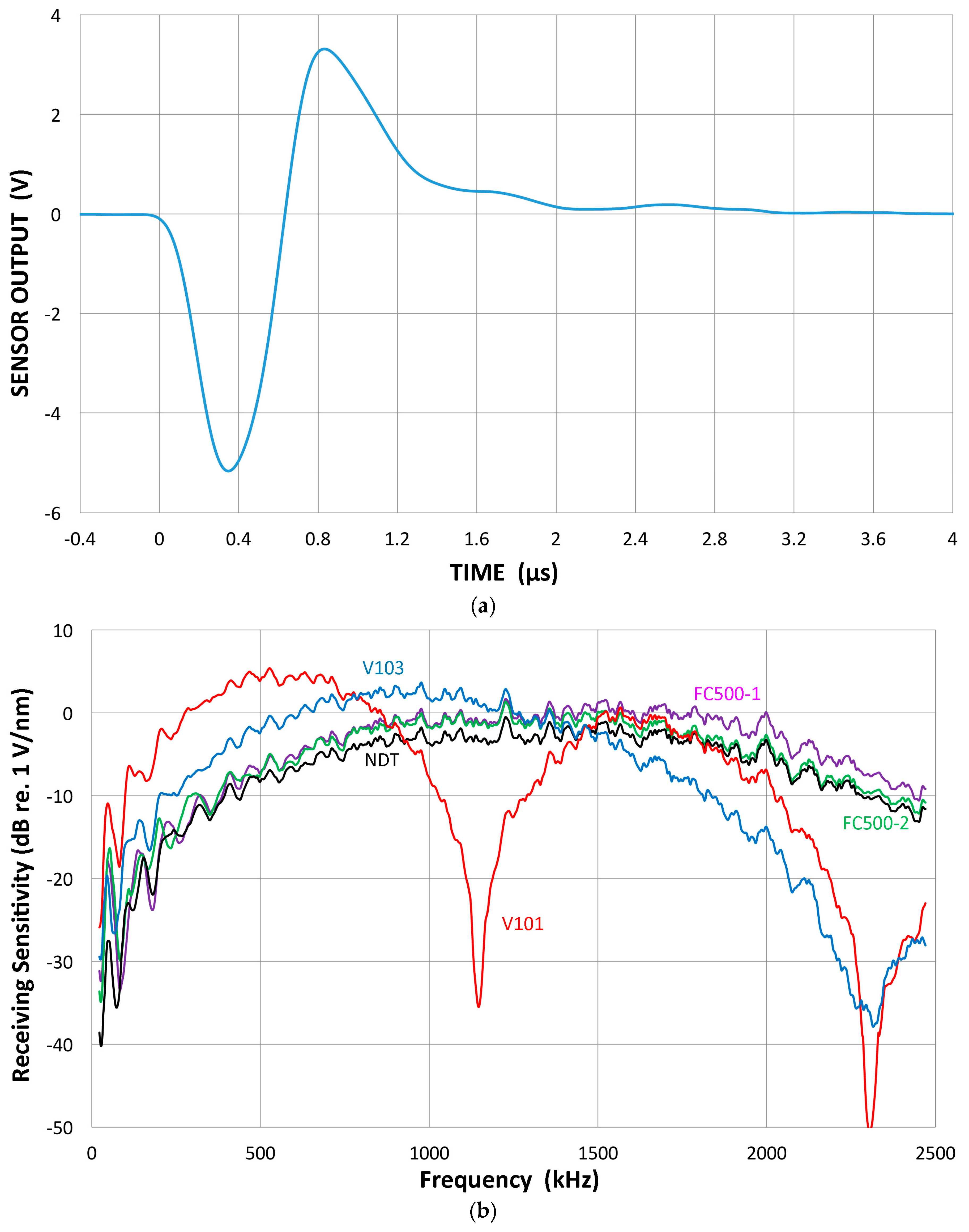(a) An example of a face-to-face experiment. Received waveform of V103 from the V104 reference transmitter. Input HV pulse spectrum is given in Figure 5, curve 1; (b) The receiving sensitivities of five UT transducers; Olympus V101, V103, NDT Systems C16 and two of AET FC500.