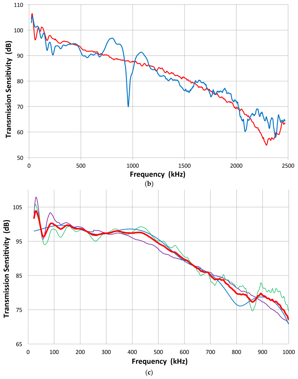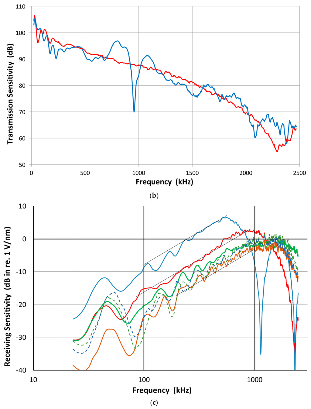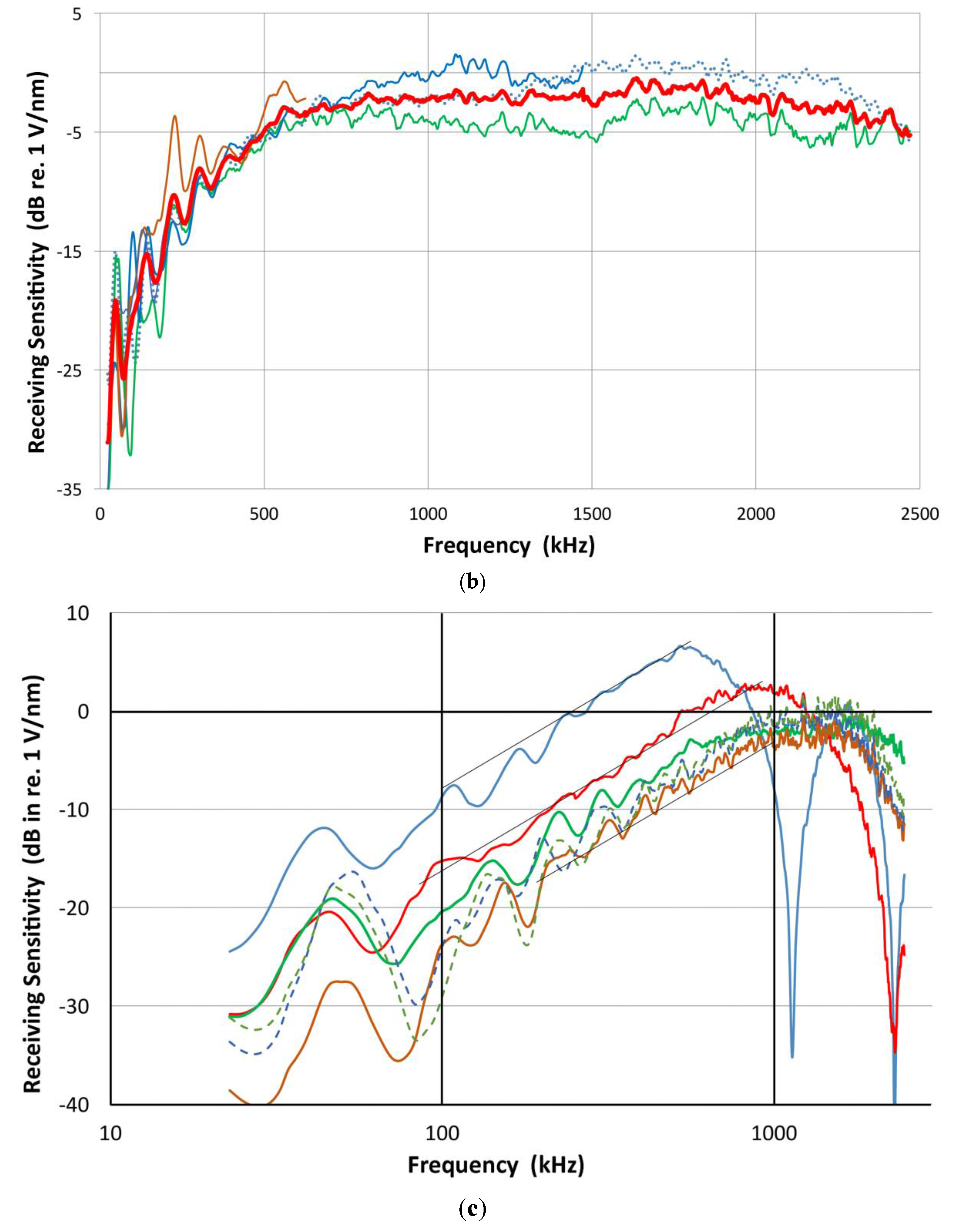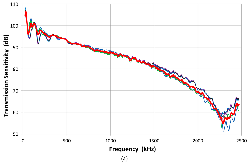 The indirect method can be applied in reverse to determine the receiving sensitivity spectra of a transducer. For a receiver, five to six combined transmitting and receiving sensitivity spectra are determined. By subtracting the corresponding transmitting sensitivity, multiple receiving sensitivity spectra were determined and averaged. Two such examples for V103 and V104 are shown in Figure 9a,b, where thick red curves indicate the averaged spectra, while other individual spectra are plotted in thin lines. These two transducers (V103 and V104) have the peak sensitivity near 1 V/nm (within ±2 dB). This procedure is needed for V104 receiving sensitivity, but generally this is a back-up method for receiving sensitivity determination as it is further removed from the original laser interferometric calibration and errors could accumulate. Results of the two methods, direct and indirect, generally agree within 2 dB. When the receiving sensitivity spectra of broadband transducers are plotted against log f, as shown in Figure 9c, the spectra follow linear f-dependence in some ranges below the peak sensitivity. This indicates flatness in the velocity response. The extent of this behavior is limited, however: 70–500 kHz for V101, 80–800 kHz for V103 and V104, and 0.2–1 MHz for NDT-C16, as marked by thin lines. In commonly used AE sensors, this trend was absent, however. Their spectra are dominated by multiple resonance behavior.
