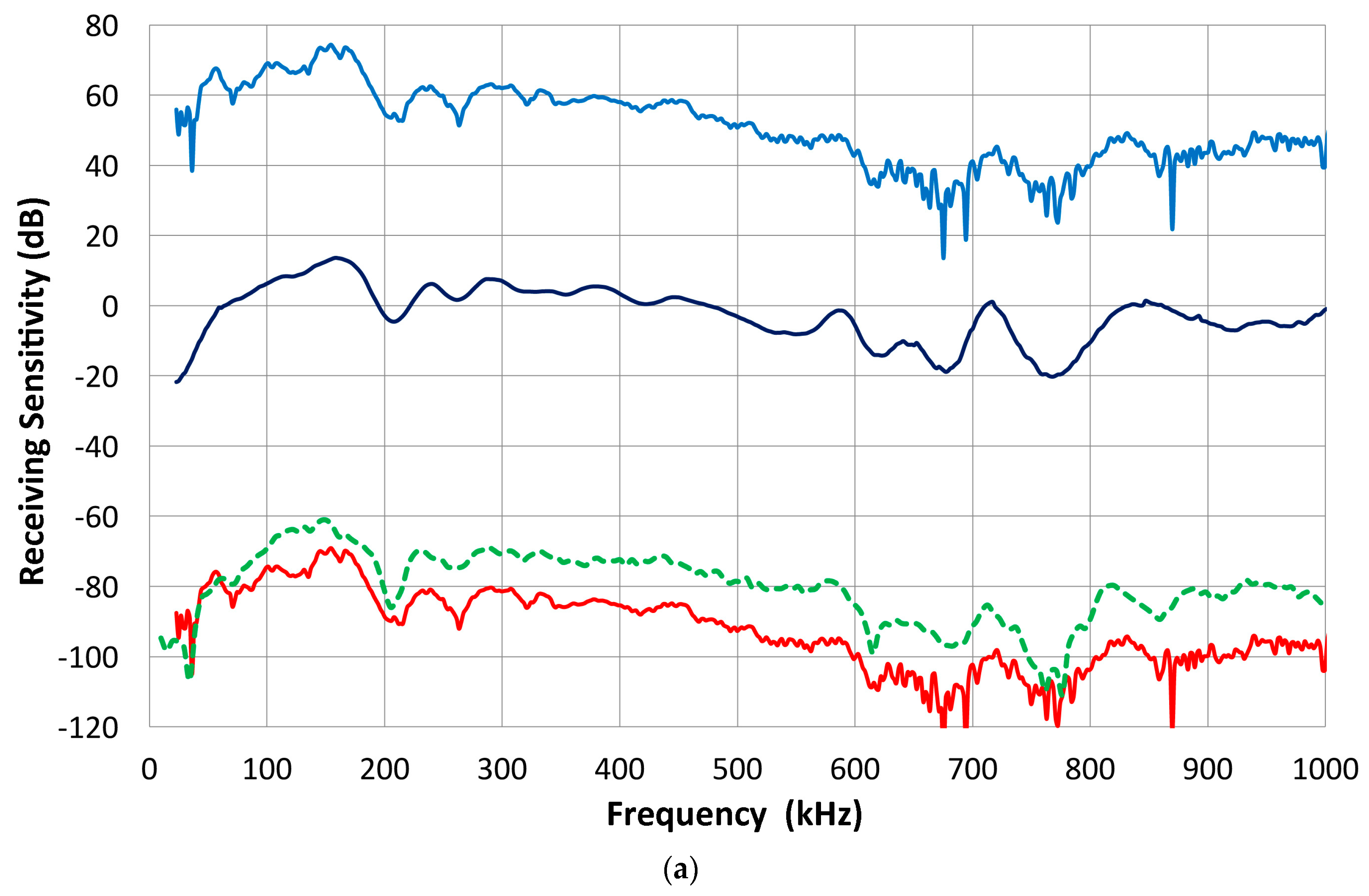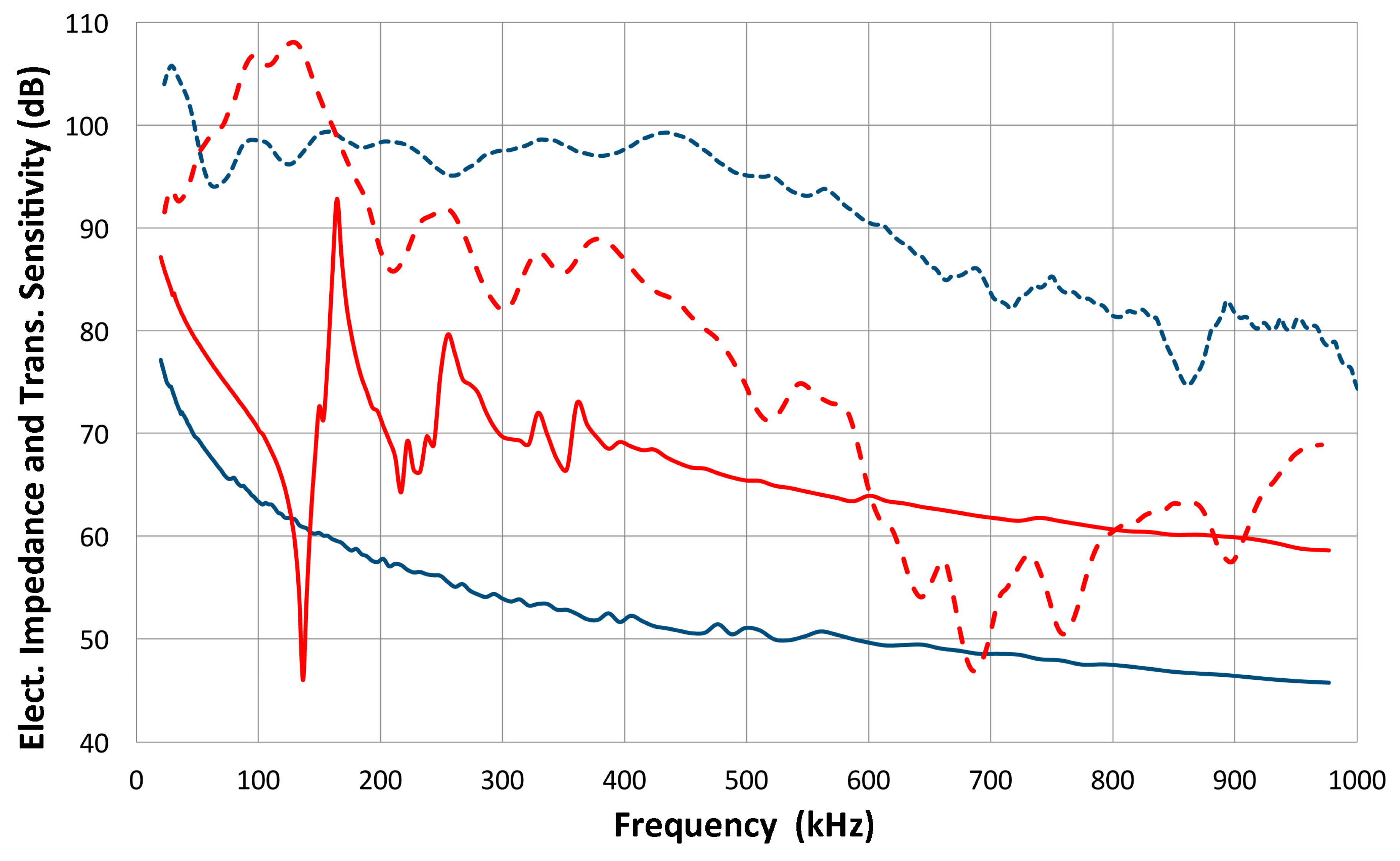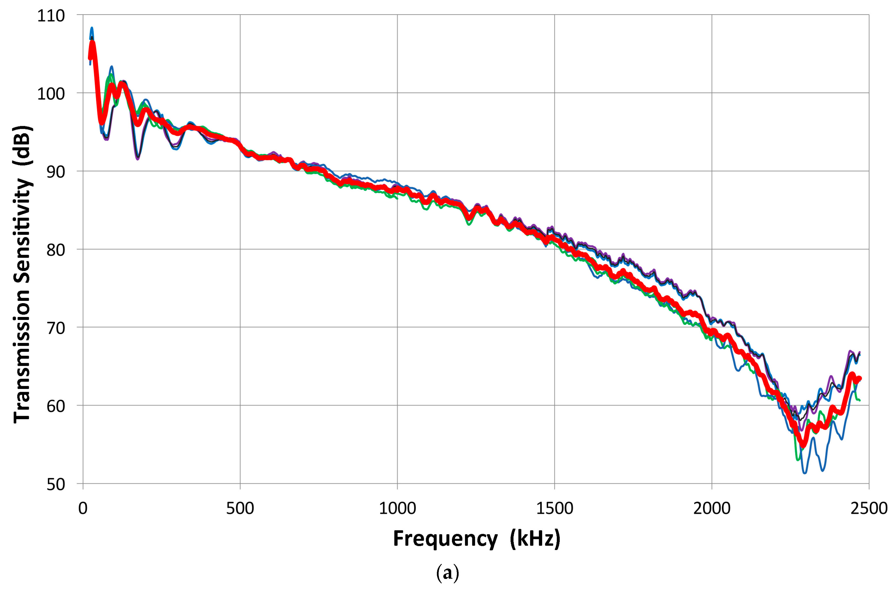 Once the transmitting sensitivity of a reference transducer is obtained, the receiving sensitivity of other transducers is determined by conducting the transmission-reception measurement in a face-to-face arrangement (set-up 2) of the reference against a transducer under test. This is the “Direct” method and gives the FFT magnitude spectral curves (with the unit of V), as shown previously in Figure 2, for the reversibility testing. The magnitude spectral curves represent the product of transmitting and receiving sensitivities (or the sum in terms of decibel values as we use them here). The receiving sensitivity of a transducer is determined by the face-to-face spectrum minus the transmitting sensitivity of the reference (V104) transducer (unit = nm). The 0 dB reference for the receiving sensitivity is 1 V/nm with frequency in kHz.