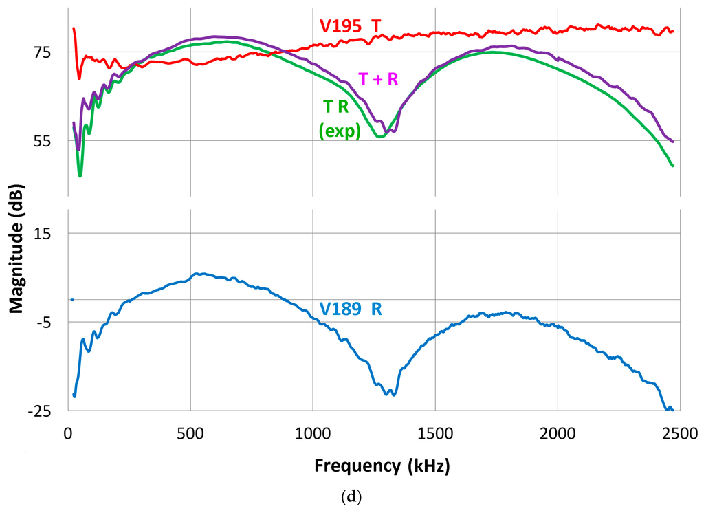Finding both the transmitting and receiving sensitivity spectra of a transducer gives a means of verifying the calibration. The combined transmitting and receiving sensitivity spectrum can be constructed for any combination of transducers and compared with the experiment. An example is given in Figure 9d. In this case, V189 and V195 were paired. Both are yet to get laser interferometric calibration. The V195 transmission spectrum was obtained from other transducers’ receiving spectra and is marked V195 T (red). The V189 receiving spectrum (V189 R) is the bottom curve. The sum of these two is plotted as “T + R” in purple and is compared to the output of face-to-face experiment, marked “T R (exp)” in green curve. These two agree well over 150–1200 kHz and 1.3–1.7 MHz, but have poorer agreement near the dip of the V189 receiver and above 1.7 MHz. For 12 cases examined in detail, spectral comparison yielded better results than the example in Figure 9d. The average discrepancy was typically about 1 dB except below 200 kHz or above 2 MHz, where the discrepancy is slightly higher. For validation purposes, we can also utilize laser-based transmitting sensitivity (but avoiding the frequency range that shows irregular peaks and dips: >250 kHz for V101, >650 kHz for V103, >1400 kHz for NDT C16). These were set aside in preference for using V104, but they do provide a back-up. Here, matching was moderate.