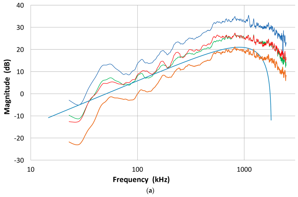 The differences between the receiving sensitivity and transmitting sensitivity (excluding the HV pulse spectrum) were calculated for 17 transducers including both broadband and resonance types. Surprisingly, the general spectral shapes of the difference (receiving minus HV-corrected transmitting spectra in decibel scale; that is, the ratio of receiving and transmitting sensitivities) were similar except for the shift in values. In terms of the symbols defined earlier for Equations (1) and (2), the magnitude plotted against the frequency represents that of Ri/ti. Four examples are shown in Figure 11a for V101 (blue curve), V103 (green), V104 (red) and NDT-C16 (brown). Below about 600 kHz, the spectral difference exhibits a power law dependence with frequency; to be exact, the dependence is f1.8 for V101, and f1.33 for the rest. All show a peak around 800 kHz and start decreasing at higher frequencies. It is also strange that the middle two curves for V103 and V104 are essentially identical despite their non-matching sensitivity spectra (cf. Figure 4, Figure 8 and Figure 9). All other spectral difference curves (excluding Olympus V195) are between the curves for V101 (top) and NDT-C16 (bottom). Figure 11b shows four more plots of Ri/ti–magnitude: the average of four R15 and R15a (green), S9220 (blue), Pico (red) and V195 (black). The top three curves fit within the limits given in Figure 11a, but the curve for V195 is completely different because its receiving sensitivity decreases more sharply than all others. Above 100 kHz, its frequency dependence is f2.4. Obviously, the internal design must be different from all others.