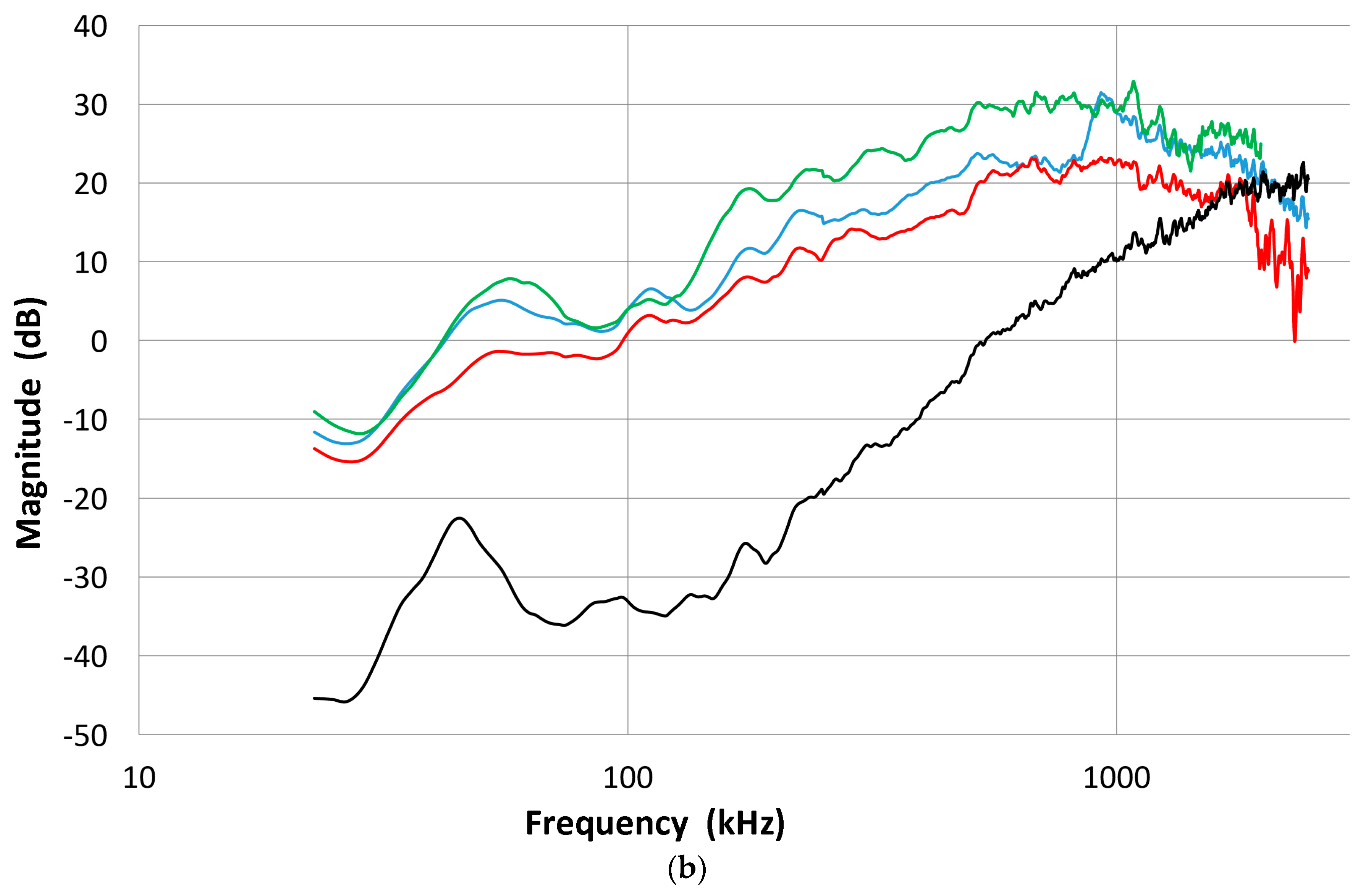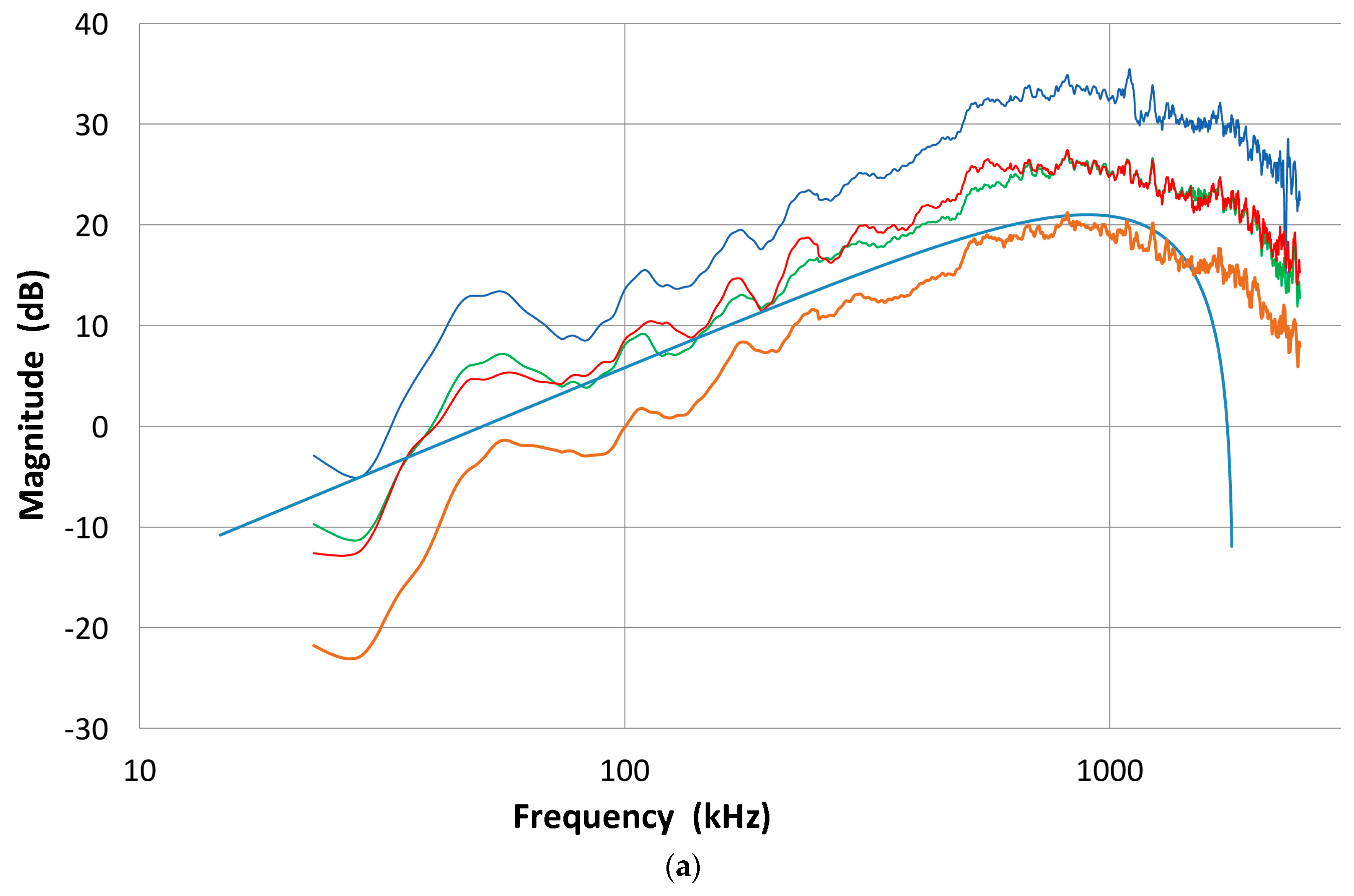 In the above FFT analysis, we used the FFT routine of Noesis software from Enviroacoustics, ver. 5.8. The sampling interval is kept at 2 ns and zero padding is used to keep the sample length of 262,144 points, giving the frequency step of 1.907 kHz. In most cases, a smoothing filter was applied to reduce noise, cutting off the low frequency response below 20 kHz.