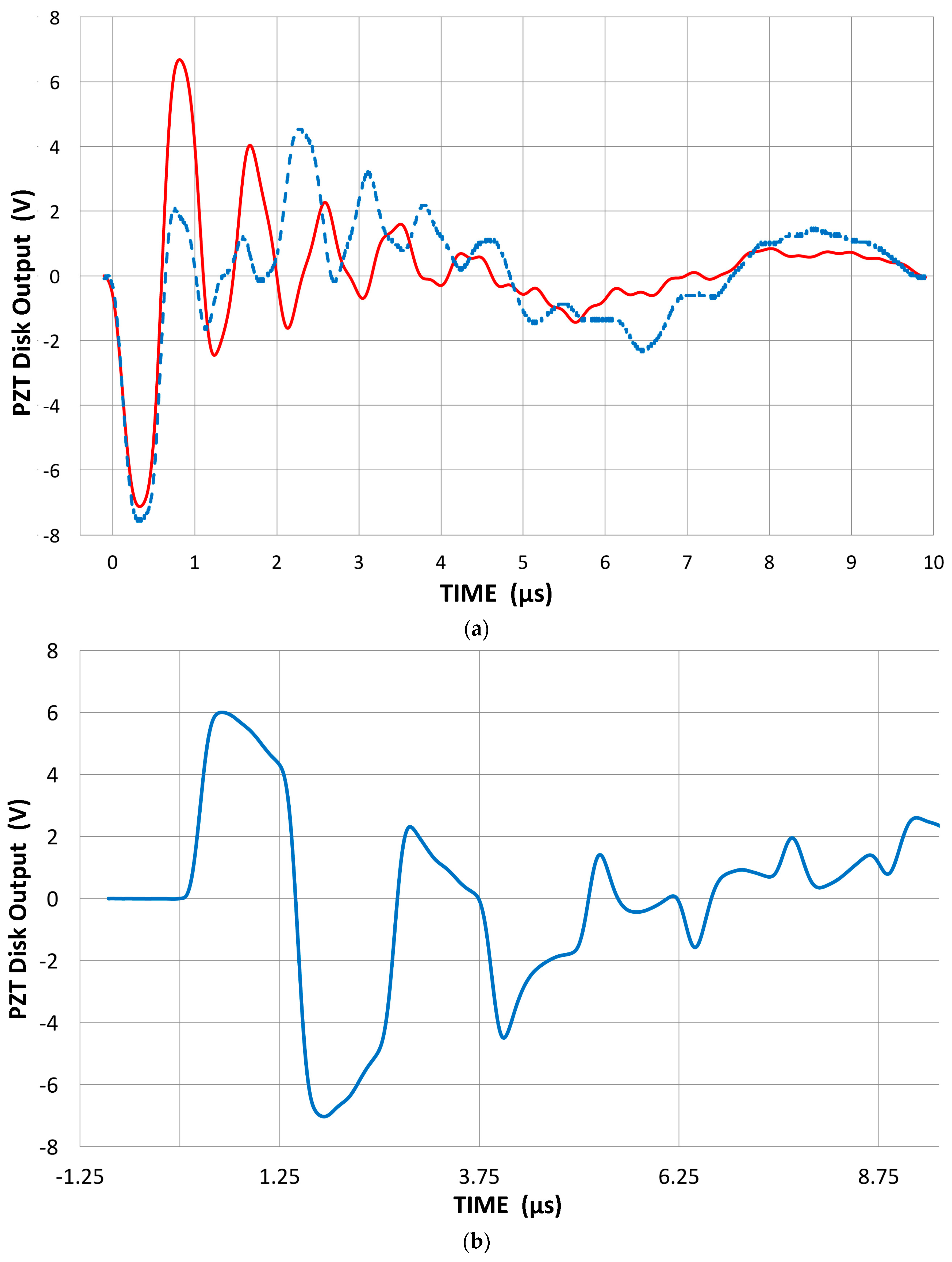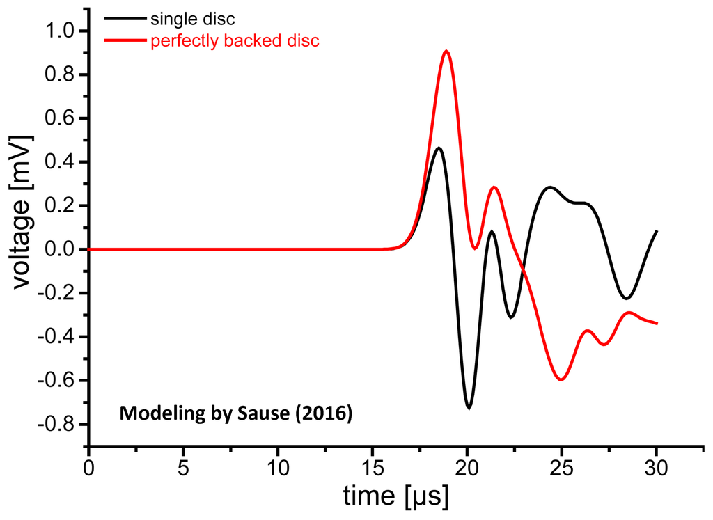 Modeling of pulse generation behavior of unbacked and perfectly backed PZT-5A disks, 3 mm thick, 10 mm in diameter. Incident plane wave is 2 µs long, cosine bell–shaped. Black: Unbacked disk case. Red: Perfectly backed disk case [46].