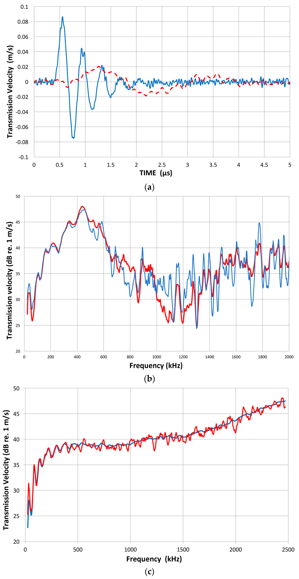 (a) Velocity transmission waveforms from transducers V101 (red, dash) and V104 (blue); (b) Velocity-transmitting spectra of V101: (blue curve). Directly differentiated spectrum, (red) 2 πf multiplication; (c) Velocity-transmitting spectra of V104: (blue curve). Directly differentiated spectrum, (red) 2 πf multiplication.