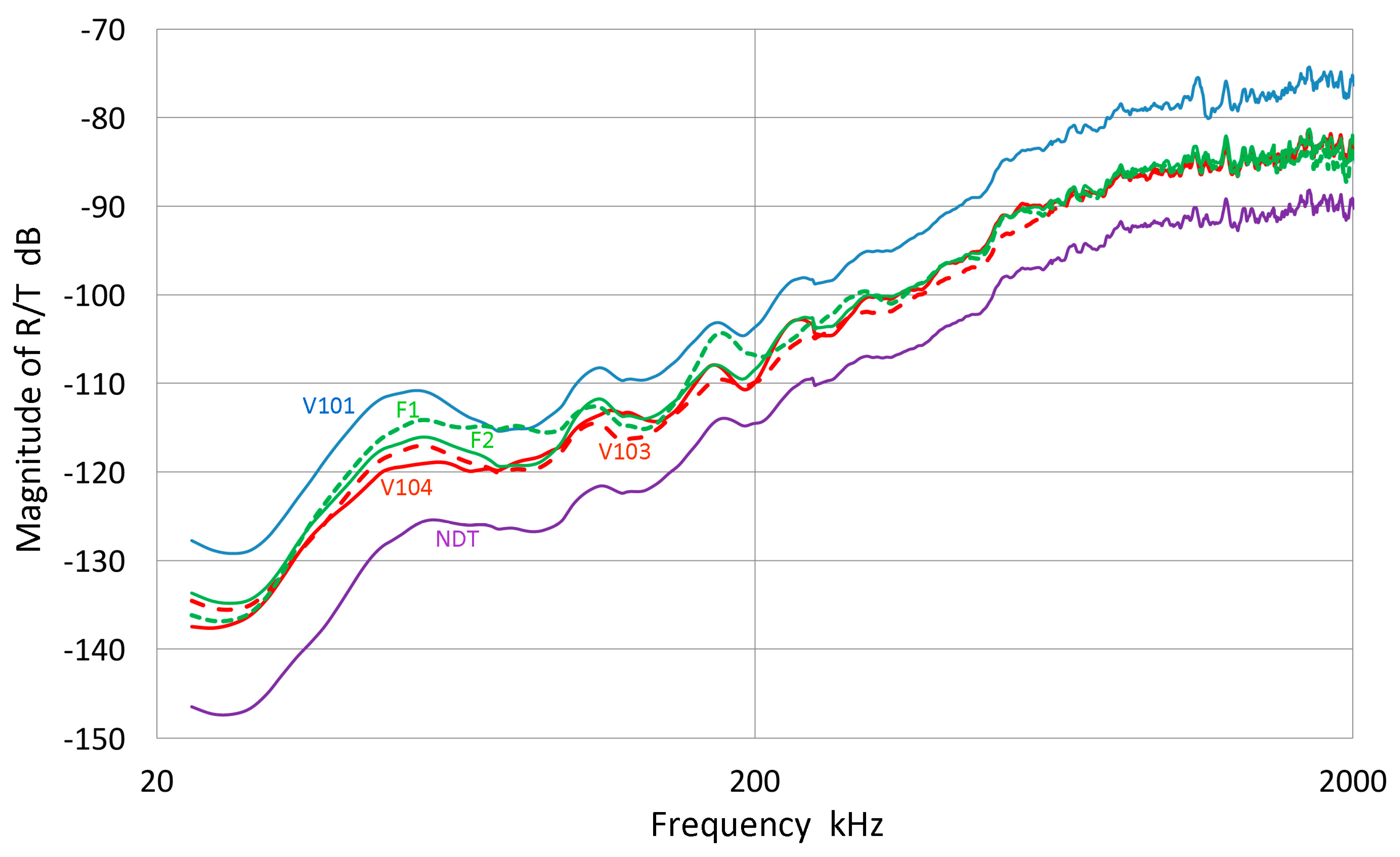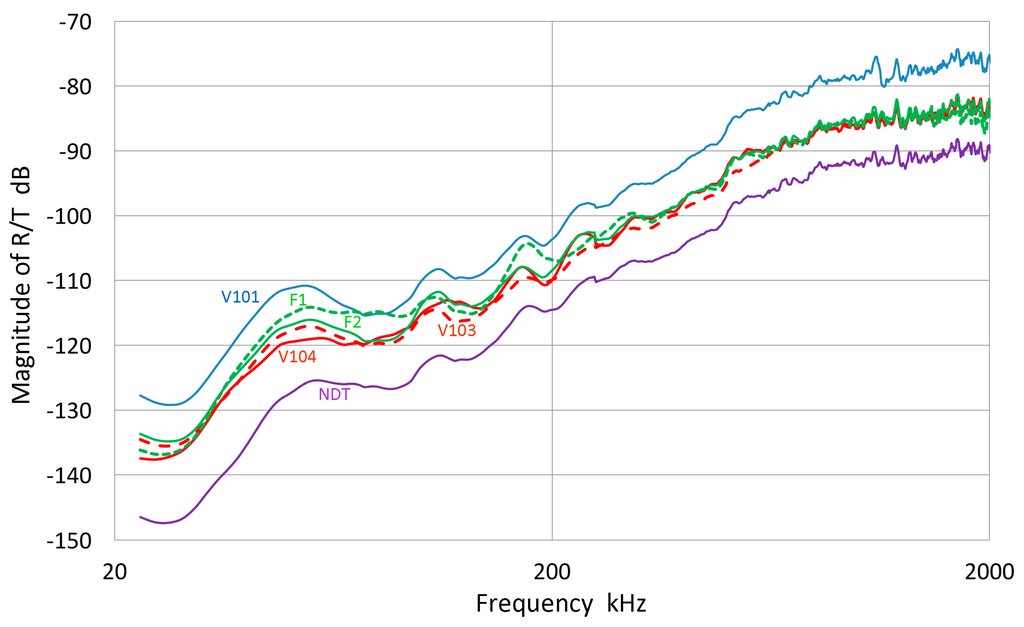 The magnitude of R/T ratios of six transducers. V101 (blue), F2 (FC500-2, green), F1 (FC500-1, green-dash), V104 (red), V103 (red, dash), NDT (purple).