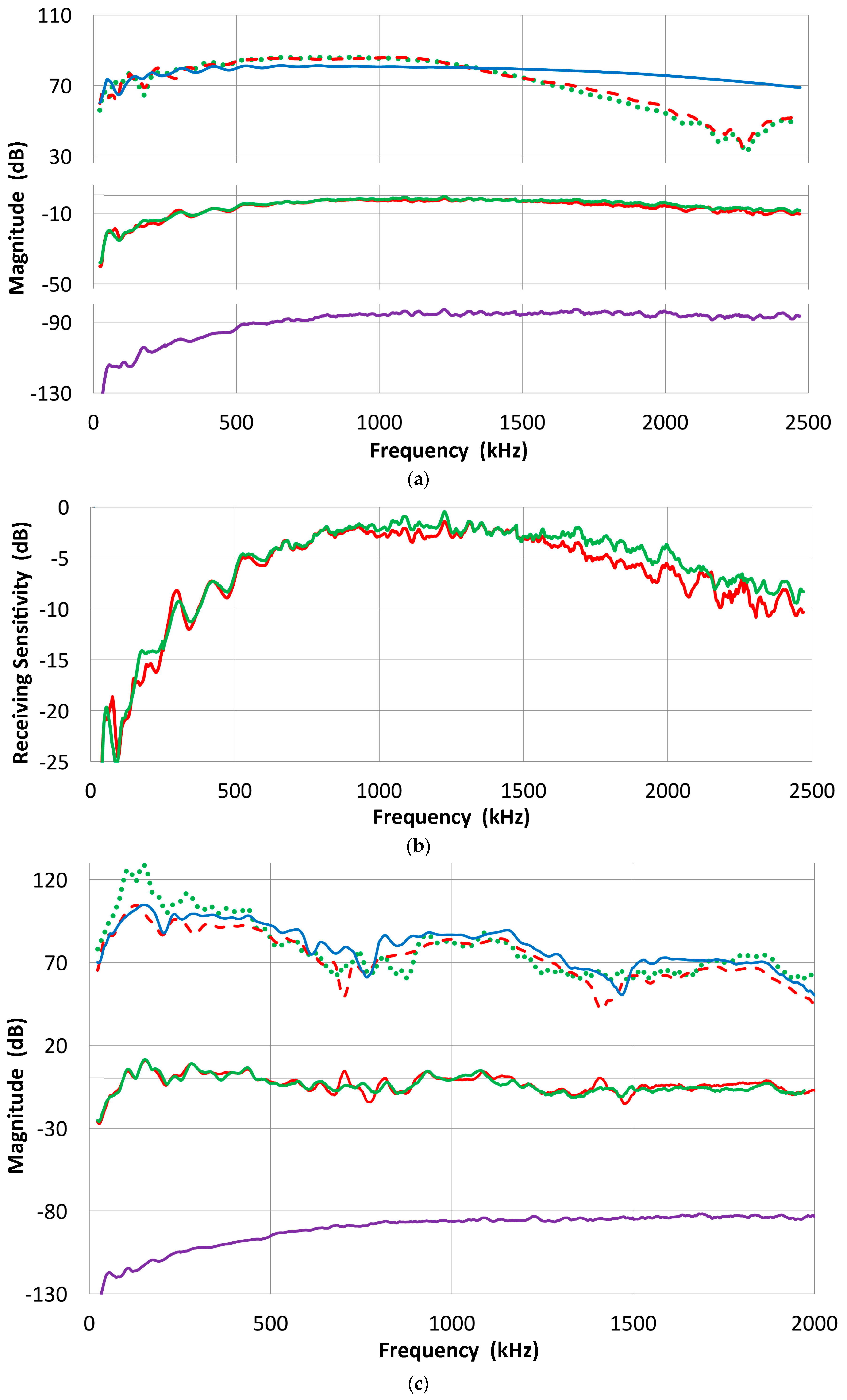 (a) Received waveforms of three conical sensors; Home-made (blue curve) and two KRN (red −35, green −60). High input impedance of 100 MΩ used; (b) Received waveforms of KRN sensors (red −35, green −60) to 48 µs; (c) Receiving sensitivities of the conical sensors (home-made: blue, K-35: red, K-60: green).
