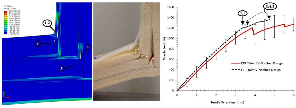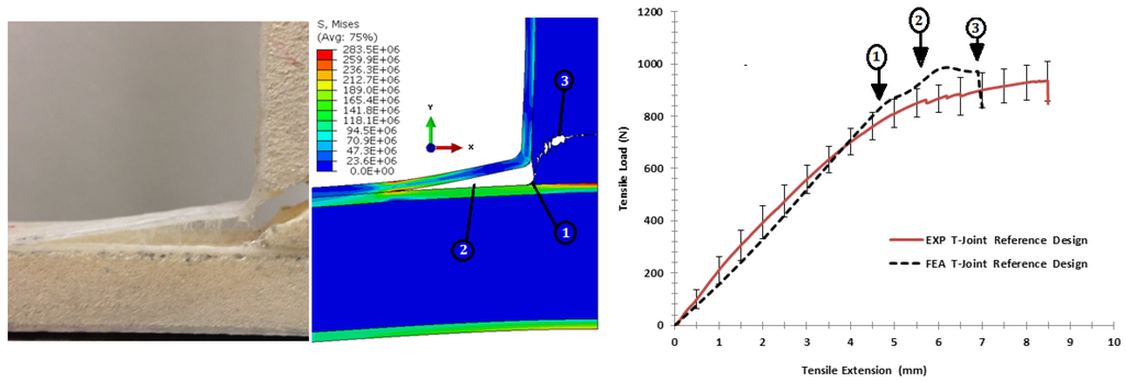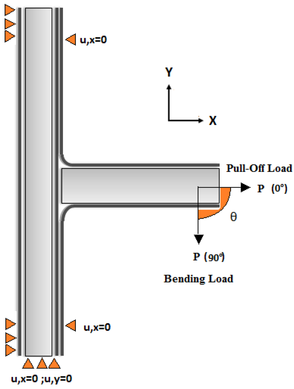 - Theotokoglou, E.E. Strength of composite T-joints under pull-out loads. J. Reinforced Plast. Compos. 1997, 16, 503–518. [Google Scholar]
