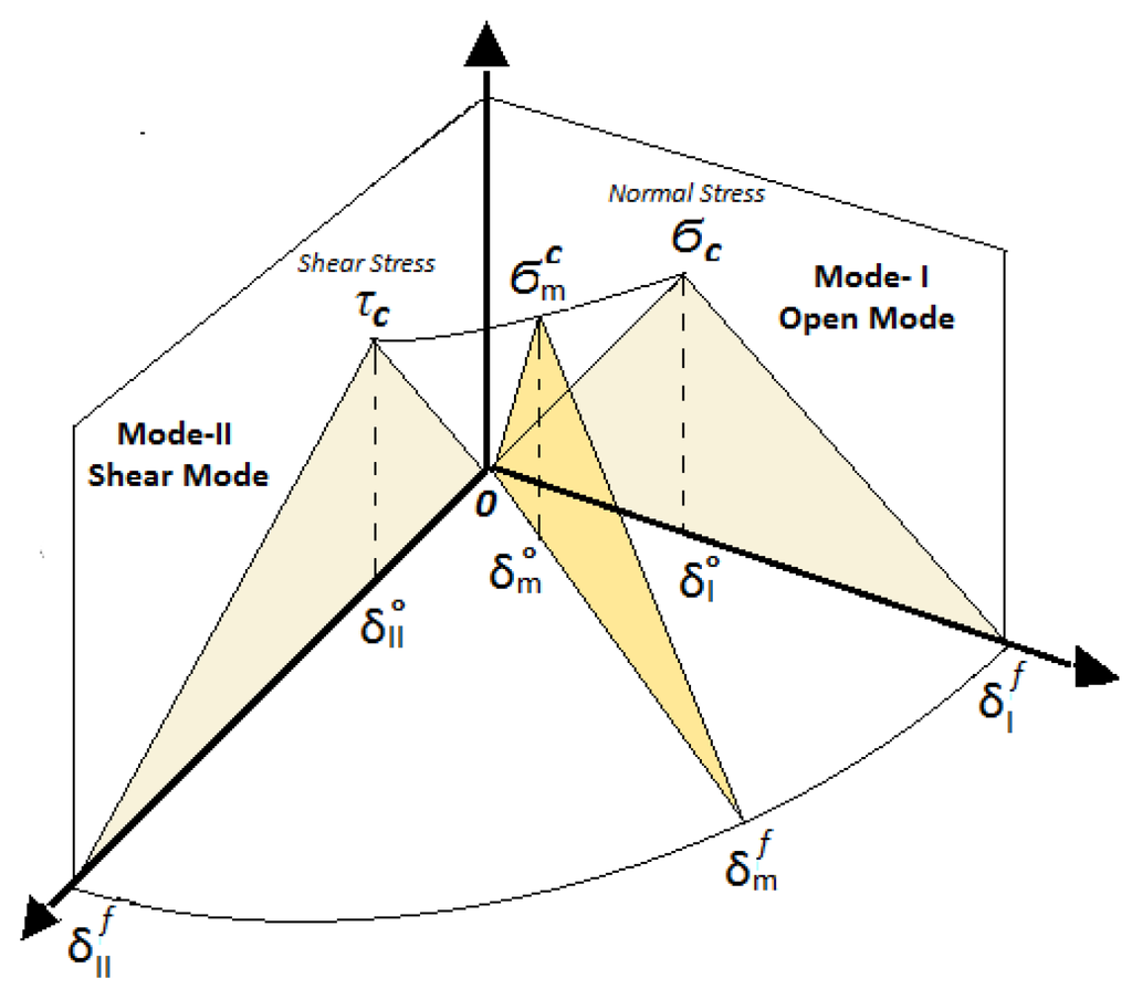 - Camanho, P.P.; Dávila, C.G. Mixed-Mode Decohesion Finite Elements for the Simulation of Delamination in Composite Materials; NASA/TM-2002-211737: USA, 2002. [Google Scholar]