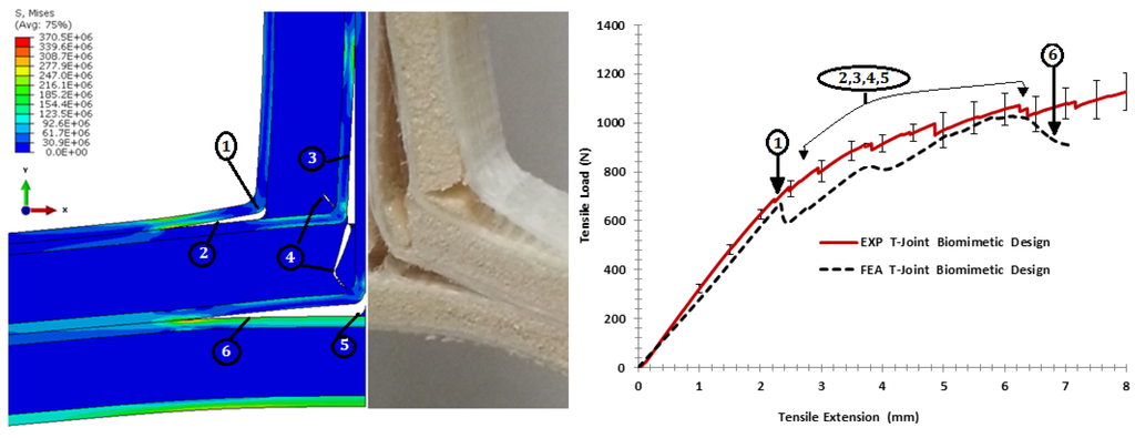 5.2. Mixed-Mode Damage of the Biomimetic T-Joint