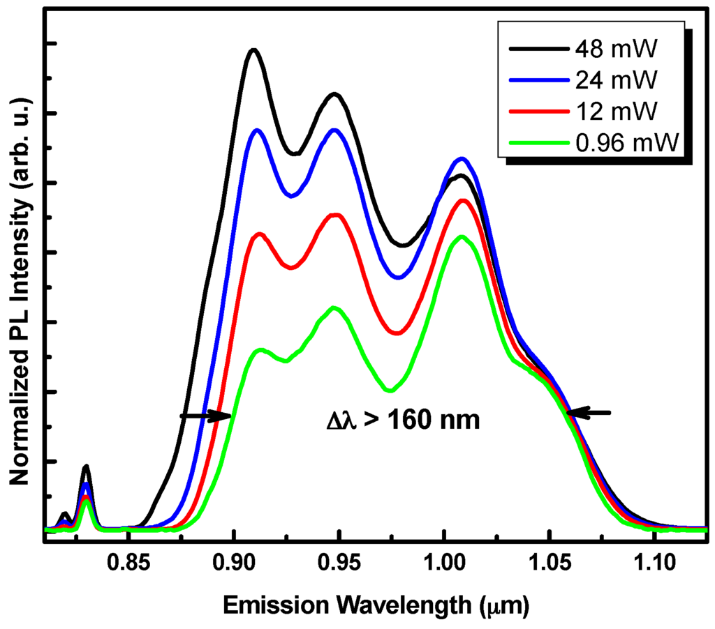 Figure 2 shows the low-temperature PL spectra at various excitation powers obtained for the 4 QD layers sample. At the lowest excitation power, the spectrum shows four distinct emission bands corresponding to the QD ground state emission bands of each QD plane of the structure. When the excitation power increases, the relative intensity of the emission bands at lower wavelengths increases significantly. This behavior is explained by the contribution of extra optical transitions between the excited states of the bigger quantum dots.