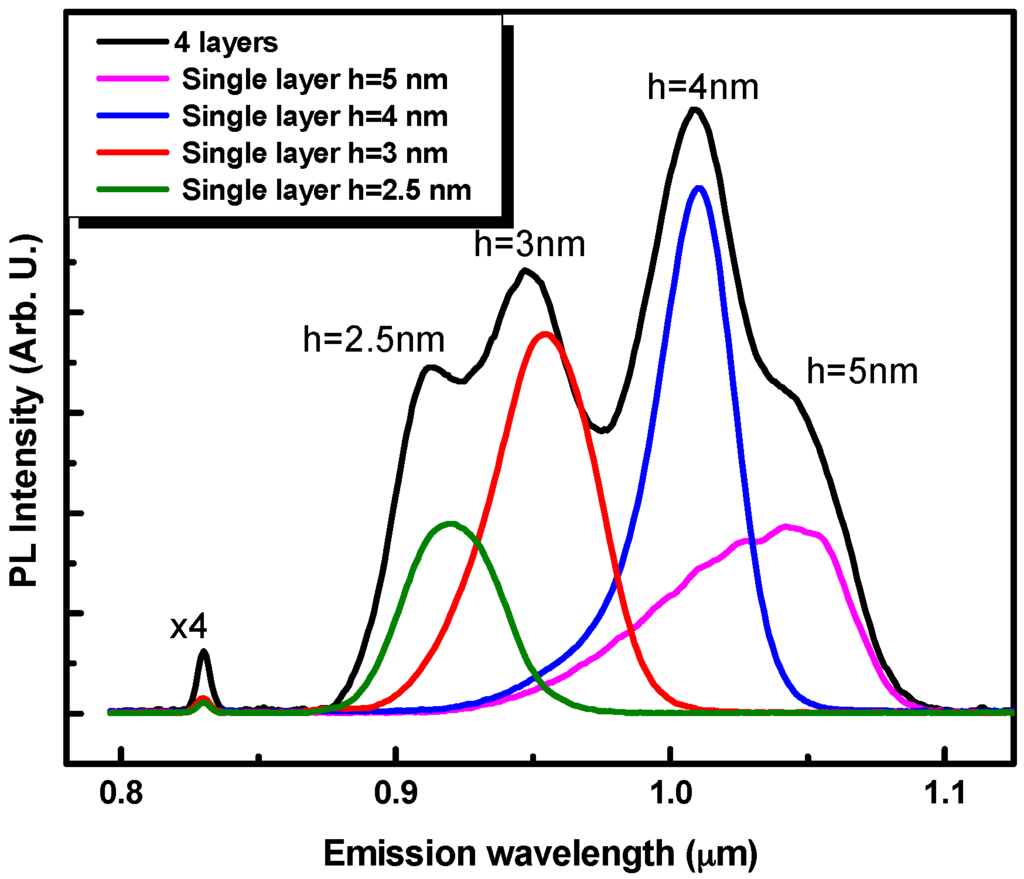 To check whether the In-flush processing of the upper QD layer affects the buried ones, low excitation power PL spectra of single QD layers with different heights are plotted in the Figure 3 together with the multipeak spectrum from vertically stacked layers. Each emission band of the four QD layer spectrums is found to match the corresponding emission band (for a given QD height) of the single QD layer spectra. This good matching indicates that the successive in situ annealing step do not alter the QD properties of the buried QD layers. These results testify that the chosen growth conditions insure a good stability of the QD structure.