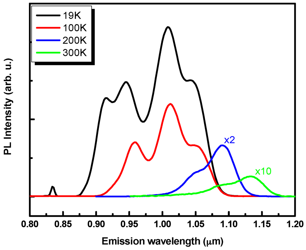 The central wavelength (λ0) and bandwidth of SLD (Δλ) are critical for improving the performance of the OCT systems []. λ0 should be within the NIR optical window, which corresponds to the range of wavelengths where light scattering and absorption by water and oxyhemoglobin (main constituents of the skin) are minimal. The axial resolution of the OCT image is evaluated using this expression []. At 300 K, the central emission wavelength of our multi-layer QD sample is around 1.1 µm, which is within the NIR optical window of interest for the imaging of biological samples []. By expecting that the emission bandwidth (Δλ) of 160 nm, observed at 19 K, can be preserved at higher temperature, the expected axial resolution of OCT images obtained using a height engineered QD structure inserted in the active layer of a SLD light source, will be 3.3 µm. Such characteristics can be useful for OCT preoperative imaging of tumor thickness (Basal Cell Carcinoma) [].
