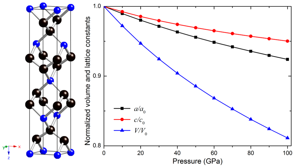 Obviously, the calculated elastic constants of t-BC2 meet all the stability criteria, demonstrating the mechanical stability of t-BC2 at ambient pressure. Furthermore, the dependences of normalized lattice parameters on pressures up to 100 GPa for t-BC2, shown in Figure 1, indicate that t-BC2 structure along the c-axis is more incompressible than along the a-axis, which coincides with the result of elastic constants (C33 > C11). The compressibility of t-BC2 along the x- and z-directions as a function of pressure can be fitted by the least square method according to the lattice parameters and pressures, and the corresponding formulas are listed as follows: