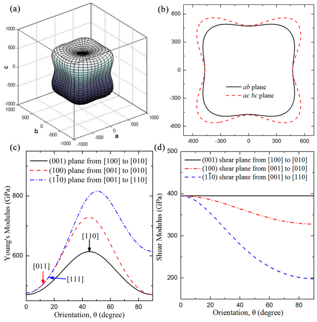 where (α1, β1, γ1) and (α2, β2, γ2) are the direction cosines of the [uvw] and [HKL] directions in the primitive coordinate system, respectively, and [HKL] directions denote the vector normal to the (hkl) shear plane. To gain deeper insight into the mechanical anisotropy of t-BC2, the three-dimension plots of the Young’s modulus as a function of the crystal orientation and its projections onto the (ab), (bc), and (ac) crystal planes are shown in Figure 2a,b, respectively. The distance between the origin of the coordinate and the surface or profile of the graph denotes the value of Young’s modulus along a certain direction. The large difference between the obtained shape and the sphere of a perfect isotropic crystal for the three-dimensional plots of Young’s modulus reveals that t-BC2 presents a high degree of anisotropy and hence is easily deformed along a certain direction under strain. Figure 2c,d illustrate the orientation dependence of Young’s modulus and shear modulus, respectively. From Figure 2c, we can clearly see that the maximum Young’s modulus (816 GPa) is 73.2% larger than the minimum Young’s modulus (471 GPa), further suggesting the high degree of anisotropy for t-BC2. The sequence of Young’s modulus along principle crystal orientations is summarized as follows: E[010] < E[001] < E[011] < E[111] < E[110]. As plotted in Figure 2d, the shear modulus along the (001) plane is independent of shear stress directions since the analytical result of shear modulus along this plane is described as G = 1/s44 = C44 = 395 GPa. The shear moduli along the (100) and () planes decrease gradually with the increase in the angle of orientation, and the minimum shear modulus (199 GPa) distributes along the [110] direction within the () basal plane.