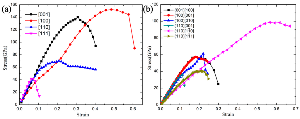 where α, β, and γ are the direction cosines of the tensile stress direction deduced from the transformed coordinate system with respect to the original coordinate system, and s11, s12, s13, s33, s44, and s66 are the independent elastic compliance constants given by Kelly et al. [], which can be determined from the calculated elastic constants Cij. The shear modulus G on the (hkl) shear plane with shear stress applied along the [uvw] direction is given by