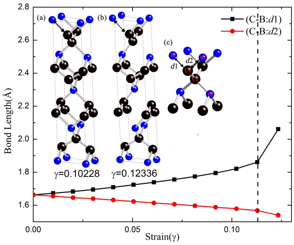 Calculated bond lengths as a function of strain for t-BC2 under shear deformation along the (110)[001] directions. Insets: crystal structures before (a) and after (b) shear instability, and basic building blocks in t-BC2 (c). The dashed line represents the shear-induced structural deformation’s first occurrence.