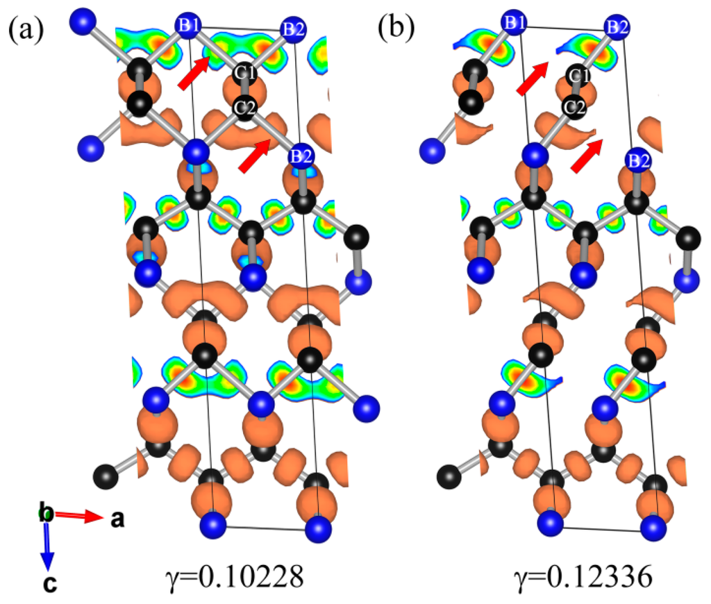 The shear stress responses in the (001), (100), and (110) planes were evaluated to search the easy cleavage plane of t-BC2. From Figure 3b, we can conclude that the ideal shear strengths show a high degree of anisotropy along the different shear directions, and the largest ideal shear strength in the shear direction (98.6 GPa) is 2.7 times larger than the lowest ideal shear strength in the (110)[001] shear direction (36.2 GPa). The minimum of the ideal shear strength is 13.0% lower than the tensile strength along the [111] direction, suggesting that the failure mode in t-BC2 is dominated by the shear type. To obtain the fundamental mechanism of plastic deformation along the weakest shear direction, the bond lengths of d1 and d2 B–C bonds as a function of the shear strains in the (110)[001] direction are plotted in Figure 4. The development of the structure for t-BC2 under shear deformation along this direction and the local bonding structure are also sketched by the inset a, b, and c in Figure 4. Clearly, the d1 and d2 B–C bonds are identical at equilibrium (shear strain γ = 0). Then, with the increase of shear strain, the d1 B–C bond declines slightly but the d2 B–C bond rises rapidly. Once the shear strain goes beyond the critical strain (γ = 0.11279), the d2 bond increases to 2.061 Å abruptly, indicating the breaking of the d2 bond and the instability of the t-BC2 structure. In addition, the behavior of the covalent d2 bond breaking can be observed from the selected crystal structures before (inset a) and after (inset b) shear instability in Figure 4.