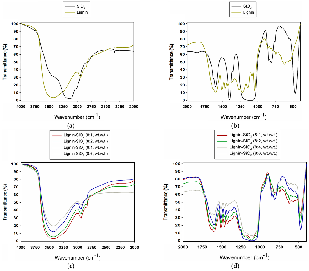 FT-IR spectra of: the precursors silica and lignin (a,b); and lignin–silica hybrid materials (c,d).