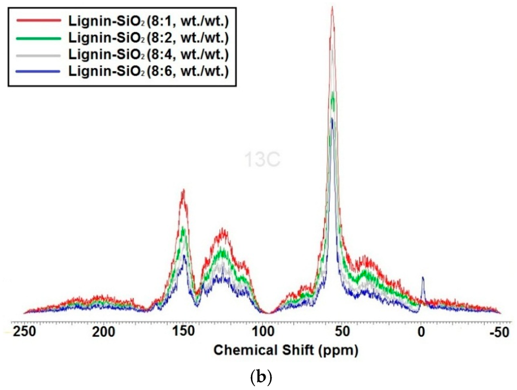 Lignin has a complicated structure and low degree of symmetry, so it produced a large quantity of signals in the NMR spectra. For that reason the change in signal intensity was small and the effect of the increased amount of silica was not significant.