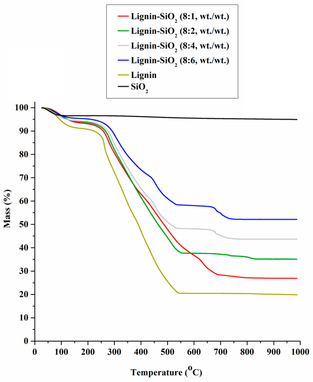 Thermogravimetric curves for lignin, silica and lignin–silica hybrid fillers.