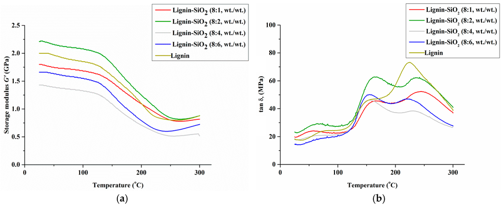 The influence of the lignin fillers on the viscoelastic behavior of phenolic resin was described in terms of storage modulus G′ and glass transition temperature Tg [29]. Comprehensive analysis of DMTA results provides information about stiffness, degree of crosslinking and interfacial bonding between filler and matrix [30]. Plots of the storage modulus G’ and mechanical loss factor (tan δ) versus temperature T are presented in Figure 4a,b. The values of the composite G’ at various temperatures and glass transition temperature Tg are given in Table 4. For a sample containing only SiO2 a homogeneous stiff material was not obtained; therefore it was not possible to investigate its thermo-mechanical properties.