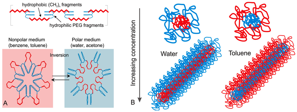 Amphiphilic invertible polymer and micelle structures (A) and micellar self-assembly (B) in polar and nonpolar solvents (reprinted with permission from [128]. Copyright 2011, American Chemical Society).