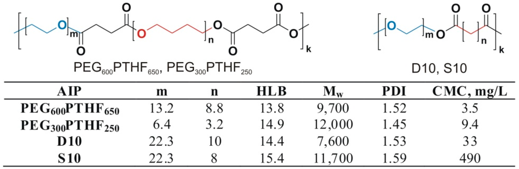 Chemical structure and characteristics of the representative AIPs. D10 is made from dodecanedioic acid and polyethylene glycol with an average Mn 1000 g/mol (PEG-1000). S10 is based on PEG-1000 and sebacic acid. The subscripted numbers indicate the average molecular weight of the copolymerized PEG and polytetrahydrofuran (PTHF) in the PEG-PTHF copolymers (reprinted with permission from [124], Copyright 2012, American Chemical Society).