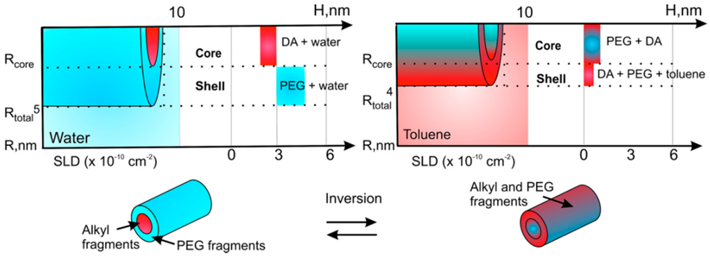 To obtain detailed quantitative parameters of the formed nanostructures, SANS measurements and their fitting according to a core-shell cylindrical model were applied. The size and detailed composition of the micellar assemblies (including the effect of temperature on the size and composition of the assemblies) were measured in aqueous and toluene polymer solutions [125]. It was shown that AIP unimers self-assemble in aqueous solution predominantly through segregation of macromolecular fragments and the microphase separation. The longer –(CH2)10– fragments of dodecanedioic acid undergo stronger interactions compared to shorter –(CH2)8– sebacic acid fragments. The latter results in closer packing of fragments in the core and formation of smaller micellar assemblies [125]. To demonstrate the inversion mechanism of AIP micellar assemblies, scattering contrast and the known scattering length densities of the solvents and the polymer components have been used [125]. It was shown that PEG and the aliphatic dicarboxylic acid fragments of the AIP macromolecule indeed tend to replace each other in the core and shell of the assemblies in response to changes in the polarity of the environmental medium from polar to nonpolar (Figure 3). Furthermore, using various dyes, the ability of AIP micelles to solubilize otherwise insoluble substances, both in polar and nonpolar solvents, was demonstrated. The dyes were immediately extracted into the solvent phase, either water or toluene, in the presence of micellar assemblies, as indicated by the clear changes in the solution color [123].