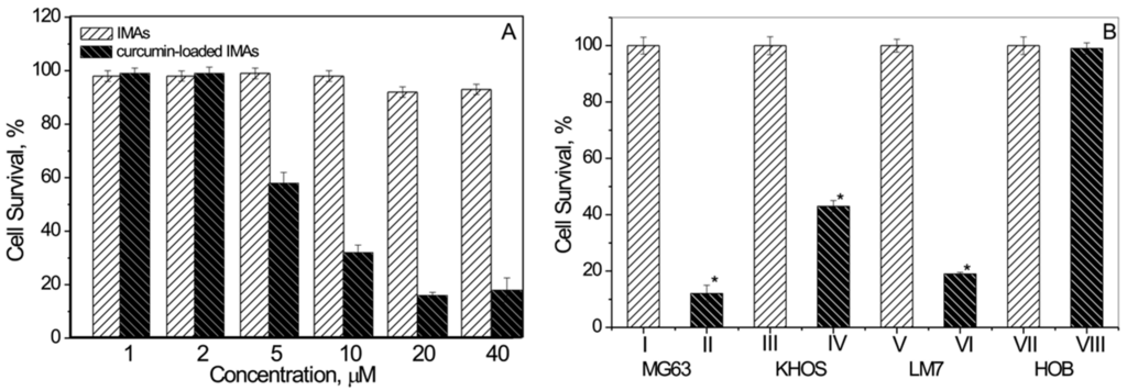 The obtained results show that three human osteosarcoma cell lines: MG63 (treated with different concentrations of micellar curcumin, Figure 4A), KHOS, and LM7 (Figure 4B) demonstrated essentially reduced cell survival in the presence of micellar curcumin. Remarkably, the blank polymer micelles had no effect on the survival of normal cells, when tested at the same concentrations.