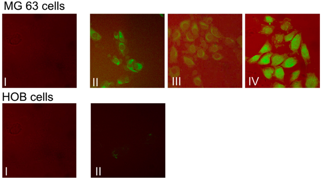 Micellar curcumin uptake in bone cells; 20 μM non-loaded assemblies (I) and micellar curcumin (II–IV) were exposed to MG63 osteosarcoma cells and normal human osteoblasts (HOB) for 30 min (I, II); 1 h (III), and 2 h (IV) (from [126]).