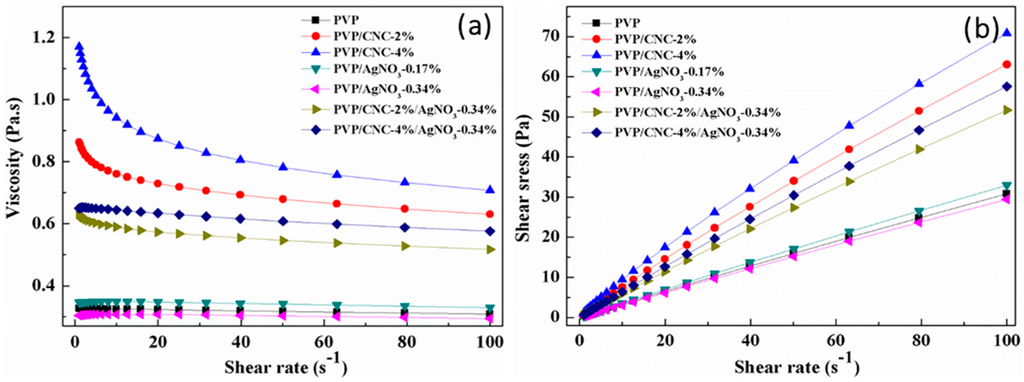 The viscosity was another critical parameter for determining the morphology of the electrospun fibers. Figure 1a shows the plots of viscosity versus shear rate for the pure PVP, PVP/CNC, PVP/AgNO3, and PVP/CNC/AgNO3 systems. The rheology behavior of the aqueous PVP solution changed from Newtonian fluid behavior to typical shear thinning behavior after adding the CNCs. The viscosity of suspension at shear rate of 0.1 s−1 increased from 0.3 to 1.2 Pa∙s after adding 4% CNCs in the PVP solution, which was due to the growth in the collision possibility of CNCs [19]. Zhang et al. reported that the orientation of macromolecular chains was the major cause of non-Newtonian behavior [44]. With the increase in the shear rate, the number of the oriented polymer segments increased, which decreased the viscosity, greatly promoting the non-Newtonian behavior. However, in comparison with CNCs, Ag+ had no effect on the pure PVP solution. Moreover, after adding 0.34 wt % AgNO3 to the PVP/CNCs suspension, the viscosity was observed to decrease by 21% and presented a similar Newtonian rheology behavior in comparison with PVP/CNC-2% polymer suspension. The PVP/CNC-4% polymer suspension also had the same tendency after adding AgNO3. For PVP/CNC/AgNO3 systems, the rheology behavior converted back to the Newtonian fluid and the viscosity was also decreased after adding silver nanoparticles compared with the PVP/CNC systems. This was due to the fact that Ag+ destroy some of the hydrogen bonds inside the CNCs, or some bonds between CNCs and PVP, which led to the appearance of competition between CNCs and Ag. All of the results indicated that the combination of CNCs and silver nanoparticles can help adjust the rheology behavior of PVP electrospun systems to meet a desired spinning need.