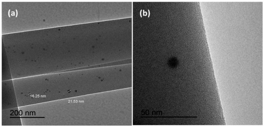 Figure 3 shows the TEM micrographs of electrospun PVP/CNC/AgNO3-0.34% fibers. Most Ag nanoparticles on the electrospun fibers had diameters between 7.84 and 21.53 nm (Figure 3a). It was clearly observed that individual fibers contained Ag nanoparticles on the surface of the fibers (Figure 3b). The Ag nanoparticles dispersed well in the electrospun composited fibers. The PVP not only promoted the nucleation of Ag nanoparticles, but also prohibited their aggregation [47]. Compared with other PVP-based composites, such as PVP/polyaniline (PANI), the aggregation between PANI was also significantly reduced by using PVP as the dispersing medium and, hence, the storage stability of the dispersions was improved as compared with a direct dispersion of PANI in distilled water [48].