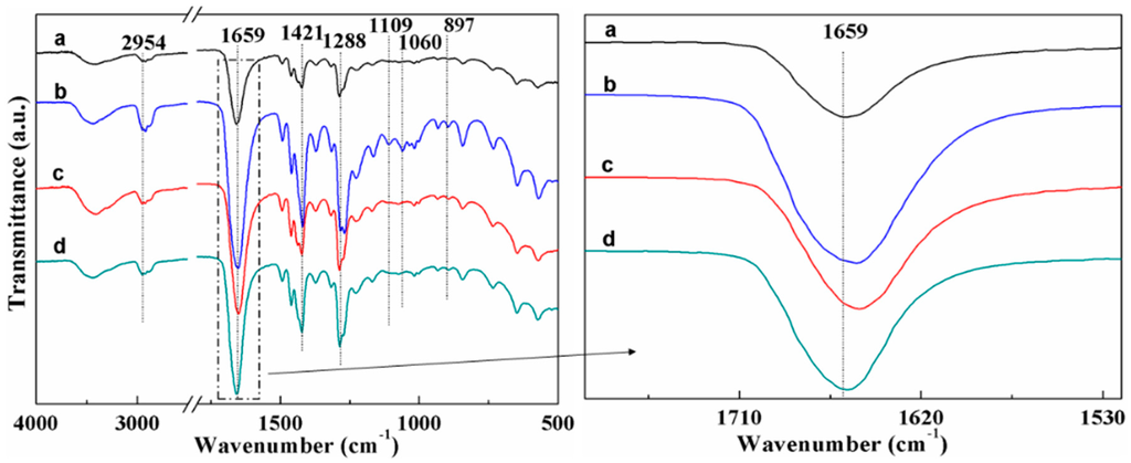 Figure 4 shows the FTIR spectra of PVP, PVP/CNC-4%, PVP/AgNO3-0.34%, and PVP/CNC-4%/AgNO3-0.34%. The peaks located at 2954, 1654, 1421, and 1288 cm−1 for PVP (Figure 4a) were assigned to the stretching vibrations of C–H, C=O, C=C, and C–N, respectively [15]. The characteristic bands such as C–O stretching at 1060 cm−1, C–H rock at 897 cm−1, and C–OH stretching at 1109 cm−1 are the spectrum of cellulose after acid hydrolysis [49,50,51]. These peaks were all observed in the blends of PVP/CNC-4%, indicating that the PVP/CNC-4% fiber composites contained both PVP and CNCs. With addition of 4 wt % CNCs, the absorption band of PVP at 1659 cm−1 shifted to 1651 cm−1 (Figure 4), which indicated the presence of some molecular interaction between PVP and CNCs. After the AgNO3 was added, the absorption band of PVP at 1659 cm−1 shifted to 1648 cm−1 (Figure 4), suggesting the presence of some interaction between Ag+ and the C=O groups [34,52]. A similar result that involves Ag and PVP has also been reported by Chen et al. [53]. However, when 4 wt % CNCs were added to the PVP/AgNO3-0.34% composites, the band of PVP/AgNO3-0.34% at 1648 cm−1 shifted back to 1659 cm−1 again. This was ascribed to the existence of Ag disturbing the hydrogen bonds in the network structure of CNCs. Then, the characteristic peaks of CNCs, such as C–O stretching at 1060 cm−1, C-H rock at 897 cm−1, and C–OH stretching at 1109 cm−1, become weak. The hydrogen bonds of CNCs crosslinked the Ag, which could help better disperse CNCs in the polymer suspensions. This was why the non-Newtonian behavior of PVP/CNC converted to Newtonian behavior after adding the silver compound.