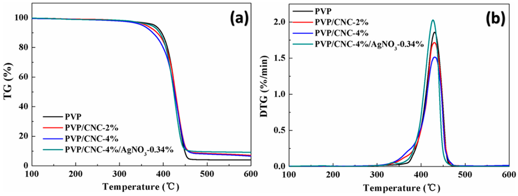 TGA and derived differential TG (DTG) curves of neat PVP, PVP/CNC-2%, PVP/CNC-4%, and PVP/CNC-4%/AgNO3-0.34% mats are shown in Figure 5a and Figure 5b, respectively. Thermal parameters, including onset thermal degradation temperature (T10%) and the maximum thermal degradation temperature (Tmax), are summarized in Table 3. Herein, the onset thermal degradation temperature is regarded as the temperature corresponding to 10% weight loss (T10%). T10% of neat PVP was 396.0 °C, while the addition of CNCs decreased the T10% to 385.8 (2 wt % of CNCs) and 375.8 °C (4 wt % of CNCs), respectively. The reason was that, in comparison with PVP, neat CNCs had a lower T10% (Table 3), which indicated the relatively lower thermal stability. However, with addition of silver nanoparticles, the T10% values of PVP/CNC-4%/AgNO3-0.34% nanocomposite mats increased to 391.6 °C, indicating that its heat resistance increased. The addition of inorganic materials always increases thermal stability of polymers [54]. The Tmax of PVP/CNC and PVP/CNC-4%/AgNO3-0.34% mats almost had no changes, compared to that of pure PVP. Figure 5a also displays the char yield of electrospun PVP/CNC-4%/AgNO3-0.34% nanocomposite fibers increased with the addition of silver nanoparticles. Increased char formation can limit the production of combustible gases, decrease the exothermicity of the pyrolysis reaction, and inhibit the thermal conductivity of the burning materials [29].