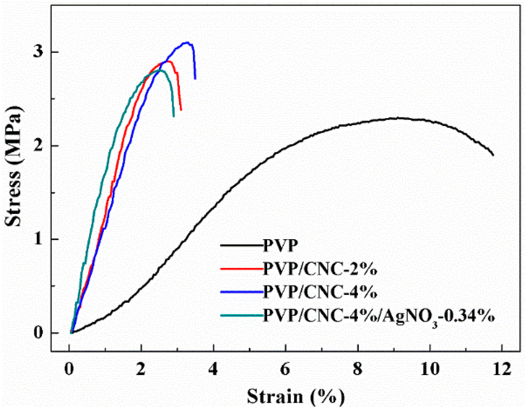Typical stress-strain curves of electrospun pure PVP, PVP/CNC-2%, PVP/CNC-4%, and PVP/CNC-4%/AgNO3-0.34% composite fiber mats.