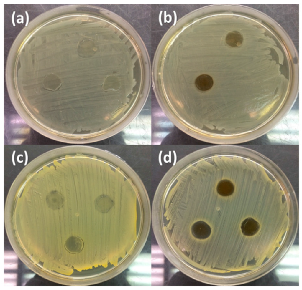 Photographs of the inhibition zones of PVP/CNC against E. coli (a) and S. aureus (c); and PVP/CNC-4%/AgNO3-0.34% against E. coli (b), and S. aureus (d).