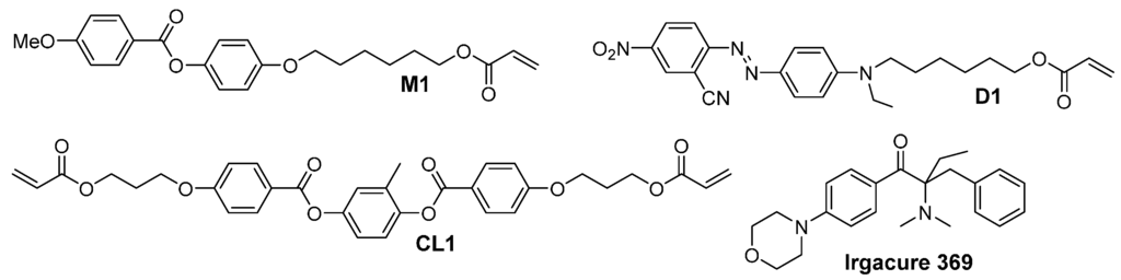 Preparation of a photoresist to create LCE structures requires the use of at least three components: a mesogen, responsible of the material alignment; a crosslinker, which allows the formation of a network with an elastic mechanic response; and a photoinitiator, to achieve the spatial control of the radical reaction. The first two components need to be functionalized with one or two photopolymerizable groups, such as the acrylate group. In this study, in order to obtain a photoresponsive material, a dye, such as an azobenzene molecule [18], is added in the monomeric formulations. Molecules employed in this study are depicted in Figure 1.