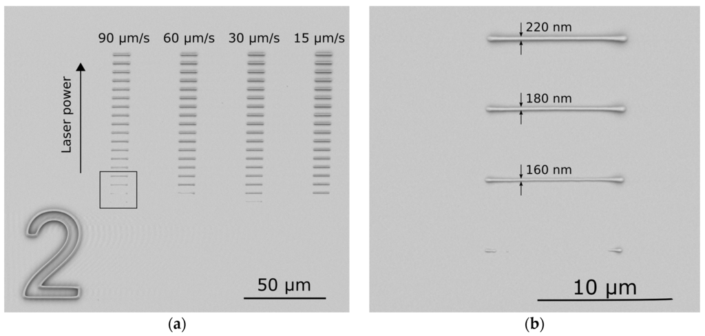 Scanning electron microscope (SEM) image of the writing tests for the threshold power for PR-20: laser power and writing speed dependence. (a) Laser power is varied from less than 1 mW up to 10 mW, adding 0.44 mW from one segment to the next with each increase in the y-position; (b) Detail of the threshold lines, zoom of the square in the (a) image.