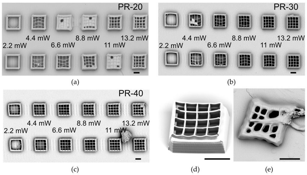 From Figure 3 it is clear that the structures realized with the PR-20 mixture are softer, with less sharp edges and higher thickness of the rods. Of course, increasing the amount of the crosslinker in the mixture results in the grids being more rigid and straight, as can be observed for the structure realized with PR-40 in the SEM image reported in Figure 3d and recorded with the samples placed at 45°.