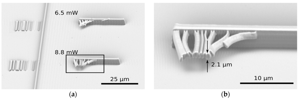 - Malinauskas, M.; Danilevičius, P.; Juodkazis, S. Three-dimensional micro-/nano-structuring via direct write polymerization with picosecond laser pulses. Opt. Express 2011, 19, 5602–5610. [Google Scholar] [CrossRef] [PubMed]