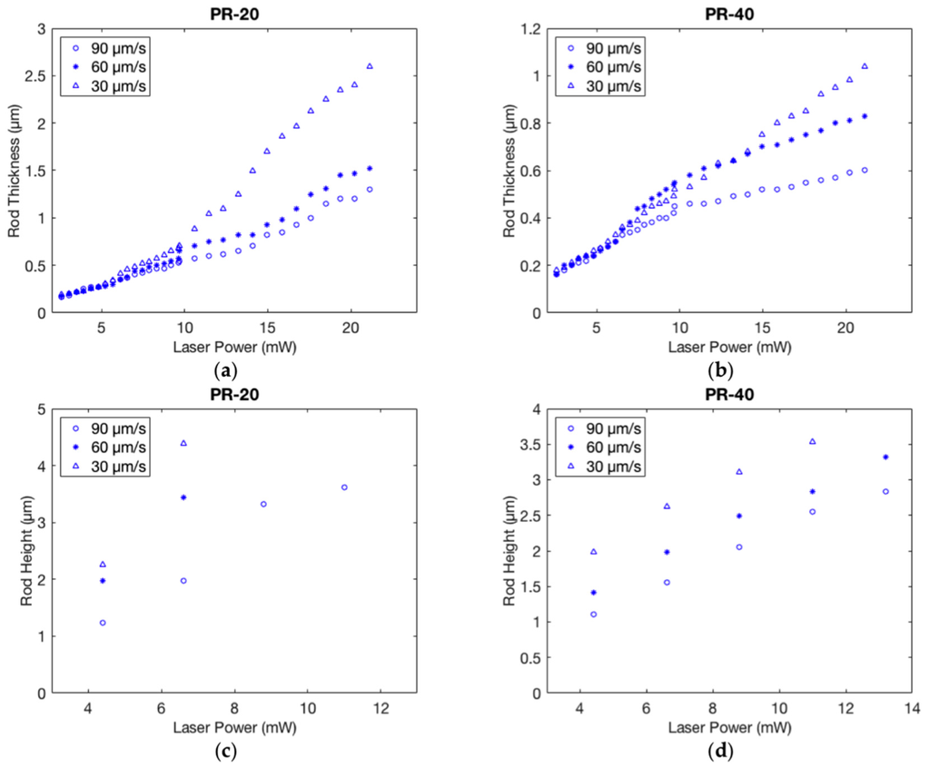 Thicknesses and heights of the voxel depending on the writing speed and the laser power. The values are reported for PR-20 in (a,c) and PR-40 in (b,d).