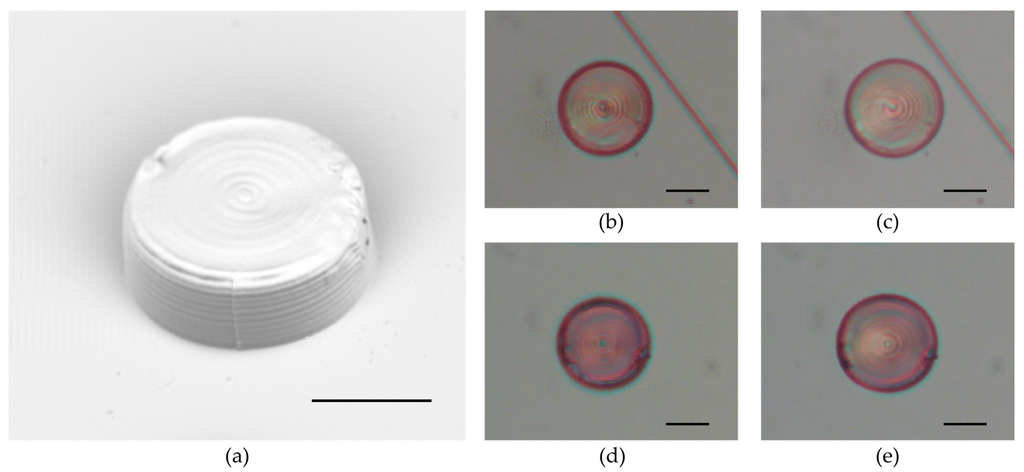 The miniaturization of many scientific devices is becoming a more and more attractive possibility. Recent progress, both in the lithographic techniques and in the material science, opens up the potential to model complex structures in the micro-scale and to functionalize the material according to the specific application requirements. In this field, polymer photonics is witnessing an increased interest thanks to the good optical and controllable properties of the polymers. The most relevant advantages of polymers are the possibility of tuning their behavior by chemically controlling the monomer structure and modeling their shape by different lithographic techniques [1]. Soft lithography—and, in particular, the two-photon polymerization technique—allows for the creation of different micro- and nano-scale objects with a desired three dimensional (3D) shape. Different commercially available polymeric formulations can be used [2]. The results of this technique are very appealing not only for producing optical devices [3,4,5] but also in different areas, such as micro-robotics [6,7] or biomedicine and tissue engineering [8].