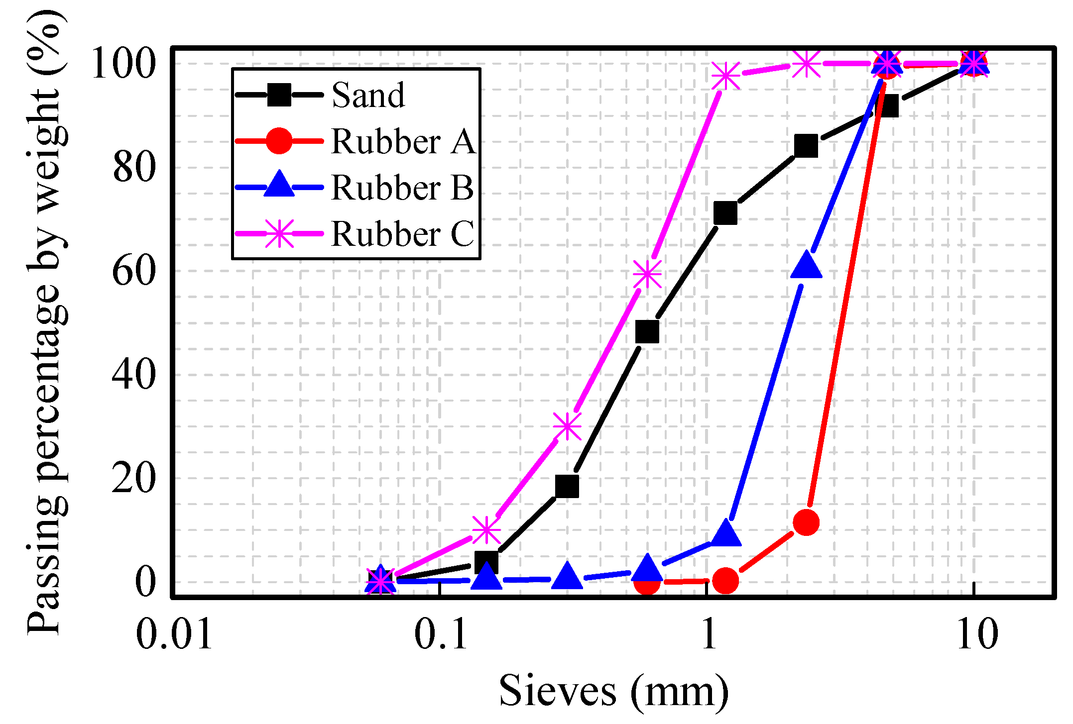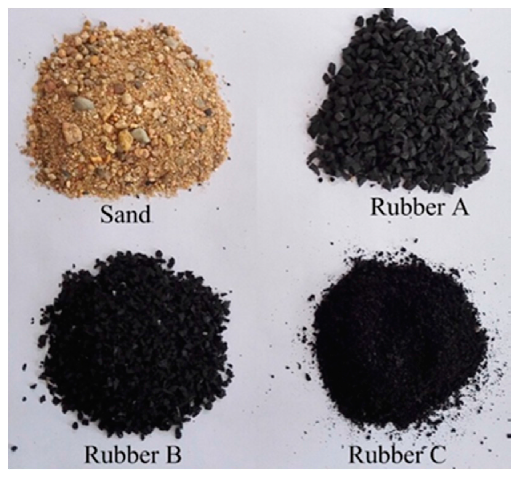 Fine aggregates: Sand, Rubber A, Rubber B, and Rubber C.