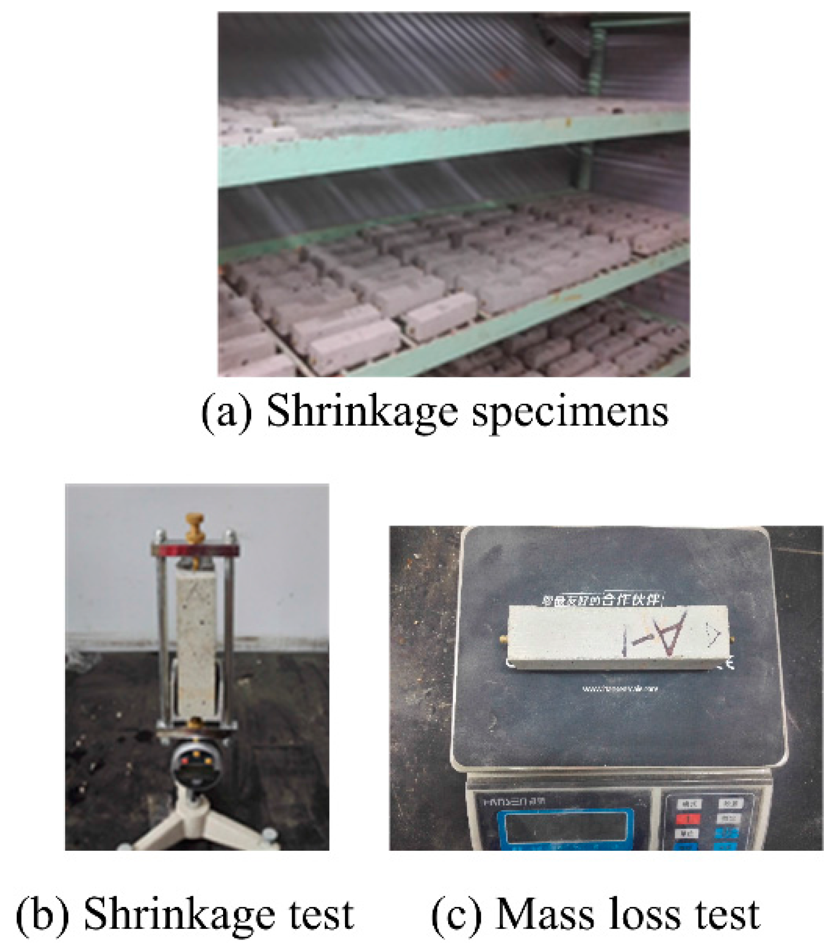 Mortar was cast in a rigid steel mold to prepare the specimens for shrinkage test. The dimensions of the mortar specimens were 40 mm × 40 mm × 160 mm. Two copper studs were embedded at the center of both ends of the specimen. The specimens were brought into the curing room after pouring. The specimens were removed from the mold after seven days. The drying shrinkage of CRM is conducted according to Chinese standard JGJ/T70-2009 [31]. The initial weight and length of the specimens were measured immediately. Afterward, the specimens were cured in a natural drying curing room at a temperature of 20 ± 2 °C and relative humidity (RH) of 50% ± 5%, as shown in Figure 4a. The length change and mass loss of the specimens, as shown in Figure 4b,c, were measured on days 2, 7, 14, 21, 28, 35, 42, 84, 98, 119, and 140.